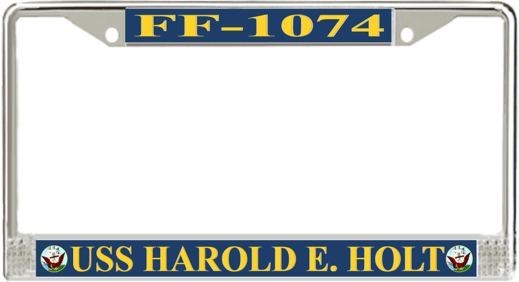 USS Harold E. Holt FF-1074 License Plate FrameThis USS Harold E. Holt FF-1074 License Plate Frame is proudly made in the USA at our facilities in Scottsboro, Alabama. Each of our MilitaryBest U.S. Navy Frames feature top and bottom Poly Coated Aluminum strips that are printed using sublimation which gives these quality automobile military frames a beautiful high gloss finish.