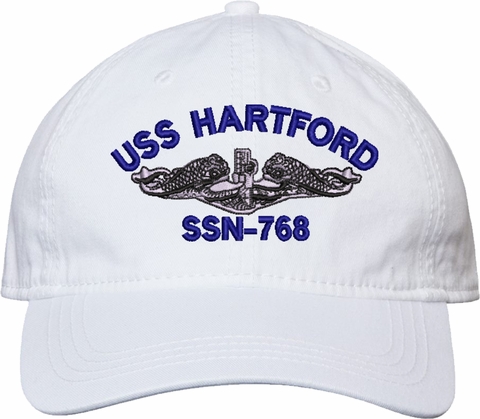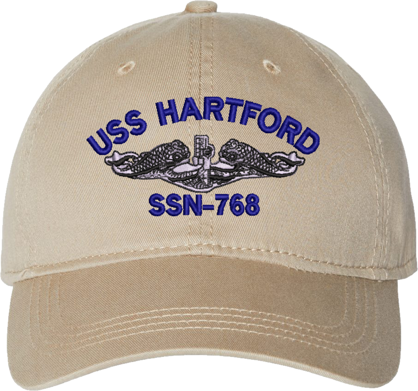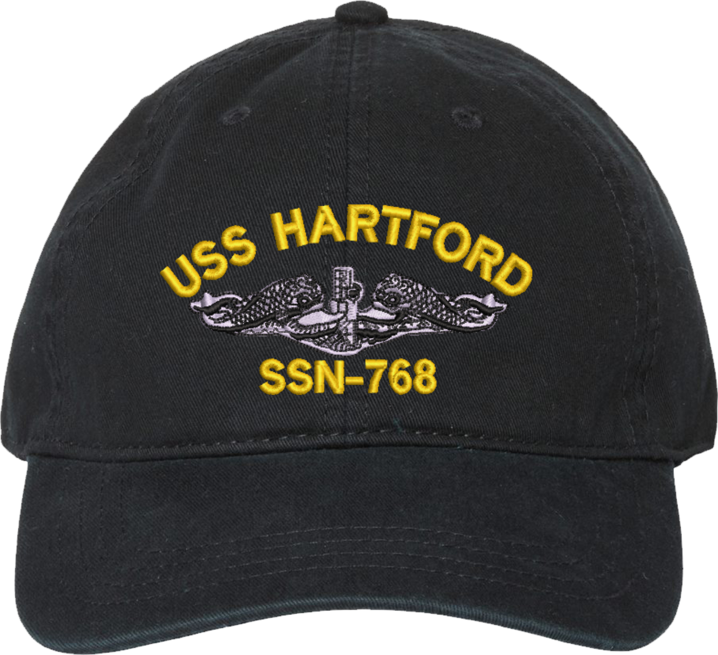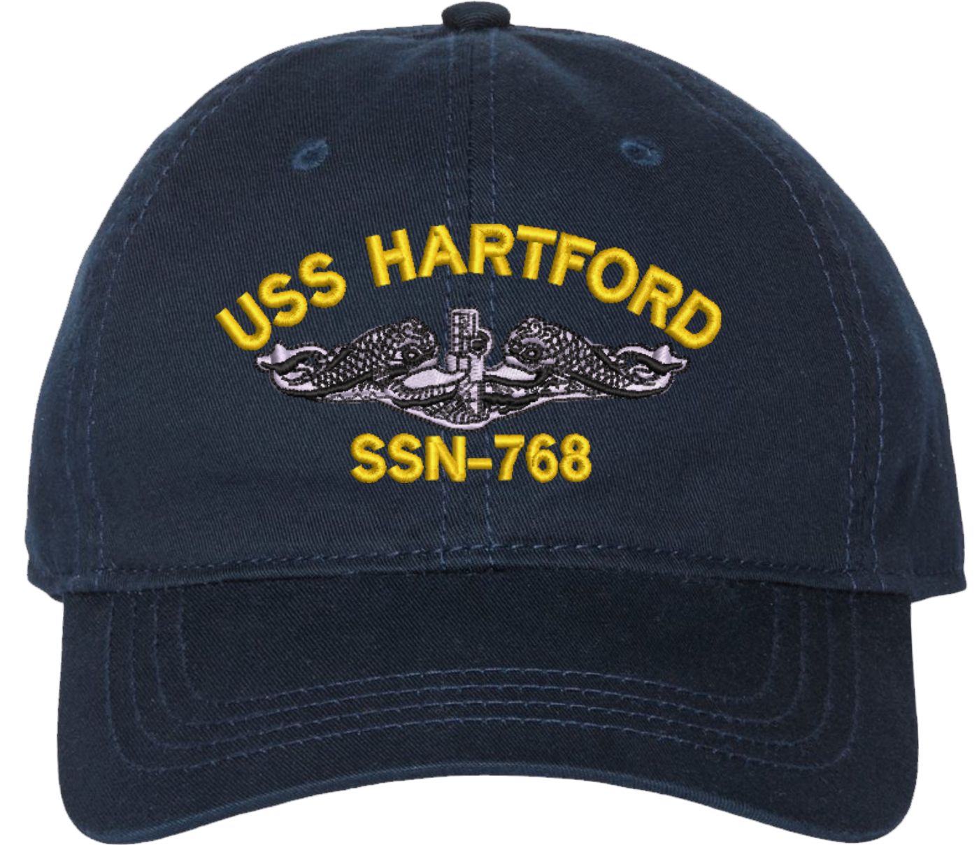 Show your Navy pride with this USS Hartford SSN-768 with Dolphins Unstructured Dad Cap from MilitaryBest. Crafted from 100% washed chino twill cotton, this six-panel, low-profile cap offers a relaxed and comfortable fit. Featuring high-quality embroidery done in our Scottsboro, Alabama facility, this cap is designed with a pre-curved visor and an adjustable tri-glide buckle closure for a perfect fit. Whether for everyday wear or as a meaningful gift, this cap is a great way to honor your own or a loved one's service.For caps ordered with custom embroidered personalized text please allow an additional 3 to 5 days production time. All custom back text will be embroidered in ALL CAPITAL LETTERS. Caps with back text or eggs are non-returnable unless there is a material defect in the cap.