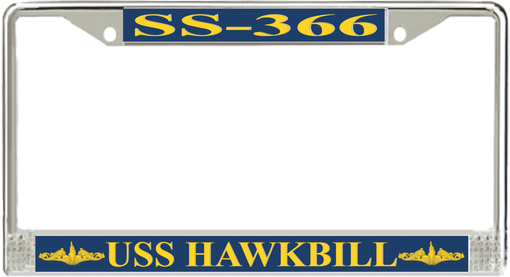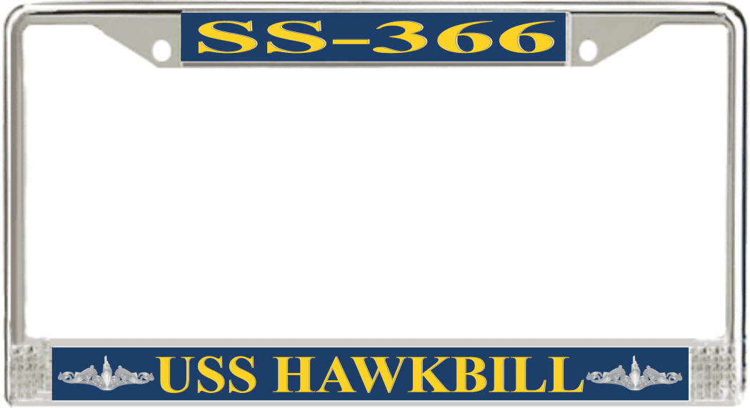 USS Hawkbill SS-366 License Plate Frame This USS Hawkbill SS-366 License Plate Frame is proudly made in the USA at our facilities in Scottsboro, Alabama. Each Frame features top and bottom sublimated design strips that are poly coated for a protective gloss finish. Please check your state and local regulations for compatibility of these frames for use on your vehicle.