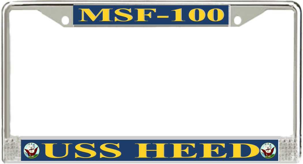 USS Heed MSF-100 License Plate FrameThis USS Heed MSF-100 License Plate Frame is proudly made in the USA at our facilities in Scottsboro, Alabama. Each of our MilitaryBest U.S. Navy Frames feature top and bottom Poly Coated Aluminum strips that are printed using sublimation which gives these quality automobile military frames a beautiful high gloss finish.