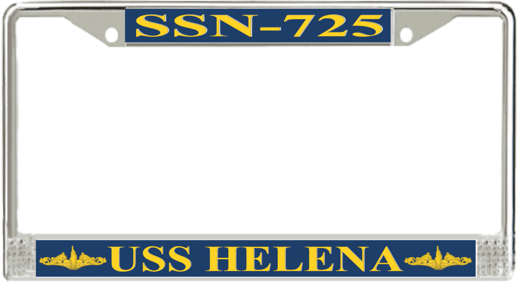USS Helena SSN-725 License Plate Frame This USS Helena SSN-725 License Plate Frame is proudly made in the USA at our facilities in Scottsboro, Alabama. Each Frame features top and bottom sublimated design strips that are poly coated for a protective gloss finish. Please check your state and local regulations for compatibility of these frames for use on your vehicle.