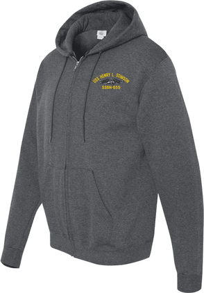 MilitaryBest has expanded its line of apparel with this custom embroidered USS Henry L Stimson SSBN-655 G with Dolphins Embroidered Zippered Hoodie. Each Hoodie is direct embroidered onto a Champion brand 9.5 oz 50/50 Cotton Poly blend. This will make an excellent addition to your wardrobe, or a great gift. Your satisfaction is Guaranteed! These quality zippered hoodies are proudly embroidered at our facilities in Scottsboro, AL. Support the Army MWR program by purchasing only from Licensed Vendors.