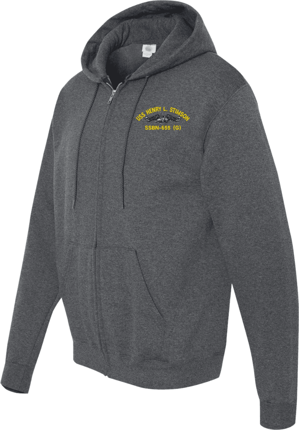 MilitaryBest has expanded its line of apparel with this custom embroidered USS Henry L Stimson SSBN-655 with Dolphins Embroidered Zippered Hoodie. Each Hoodie is direct embroidered onto a Champion brand 9.5 oz 50/50 Cotton Poly blend. This will make an excellent addition to your wardrobe, or a great gift. Your satisfaction is Guaranteed! These quality zippered hoodies are proudly embroidered at our facilities in Scottsboro, AL. Support the Army MWR program by purchasing only from Licensed Vendors.