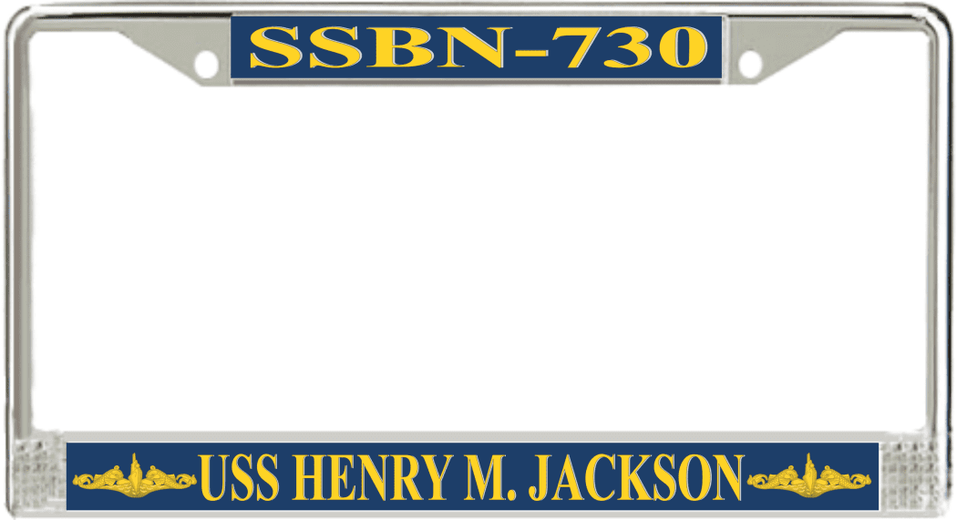 USS Henry M. Jackson SSBN-730 License Plate Frame This USS Henry M. Jackson SSBN-730 License Plate Frame is proudly made in the USA at our facilities in Scottsboro, Alabama. Each Frame features top and bottom sublimated design strips that are poly coated for a protective gloss finish. Please check your state and local regulations for compatibility of these frames for use on your vehicle.