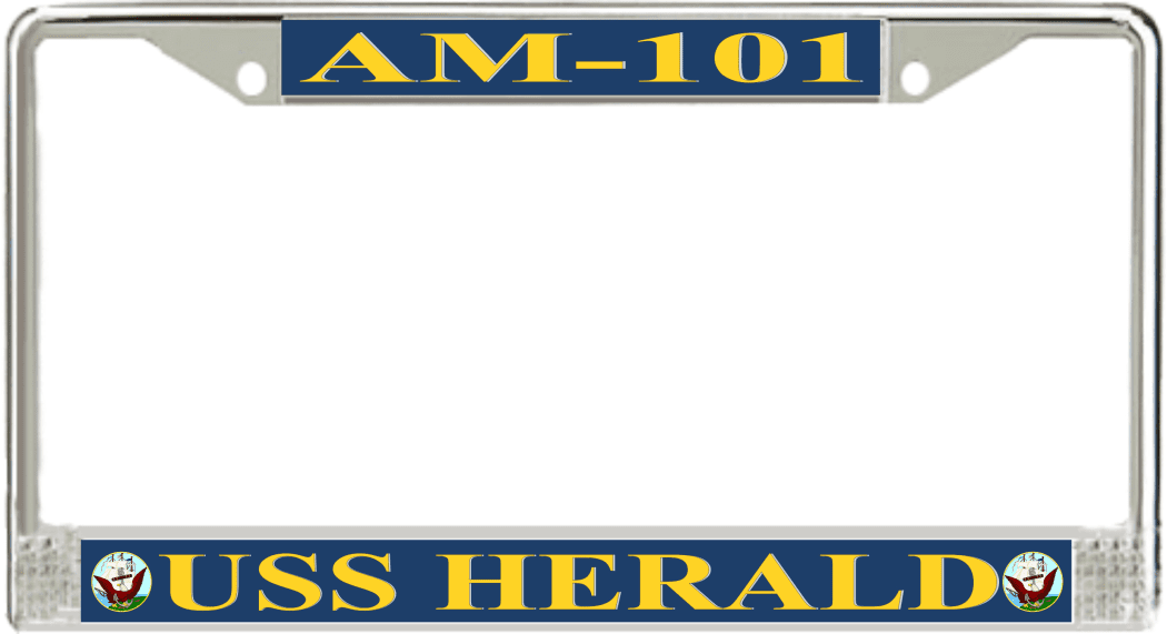 USS Herald AM-101 License Plate FrameThis USS Herald AM-101 License Plate Frame is proudly made in the USA at our facilities in Scottsboro, Alabama. Each of our MilitaryBest U.S. Navy Frames feature top and bottom Poly Coated Aluminum strips that are printed using sublimation which gives these quality automobile military frames a beautiful high gloss finish.