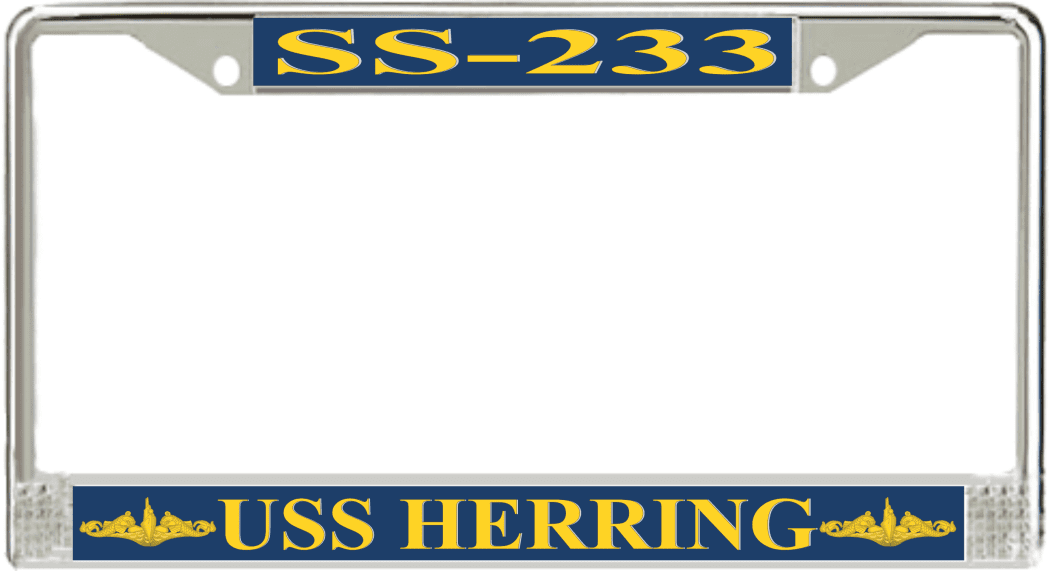 USS Herring SS-233 License Plate Frame This USS Herring SS-233 License Plate Frame is proudly made in the USA at our facilities in Scottsboro, Alabama. Each Frame features top and bottom sublimated design strips that are poly coated for a protective gloss finish. Please check your state and local regulations for compatibility of these frames for use on your vehicle.