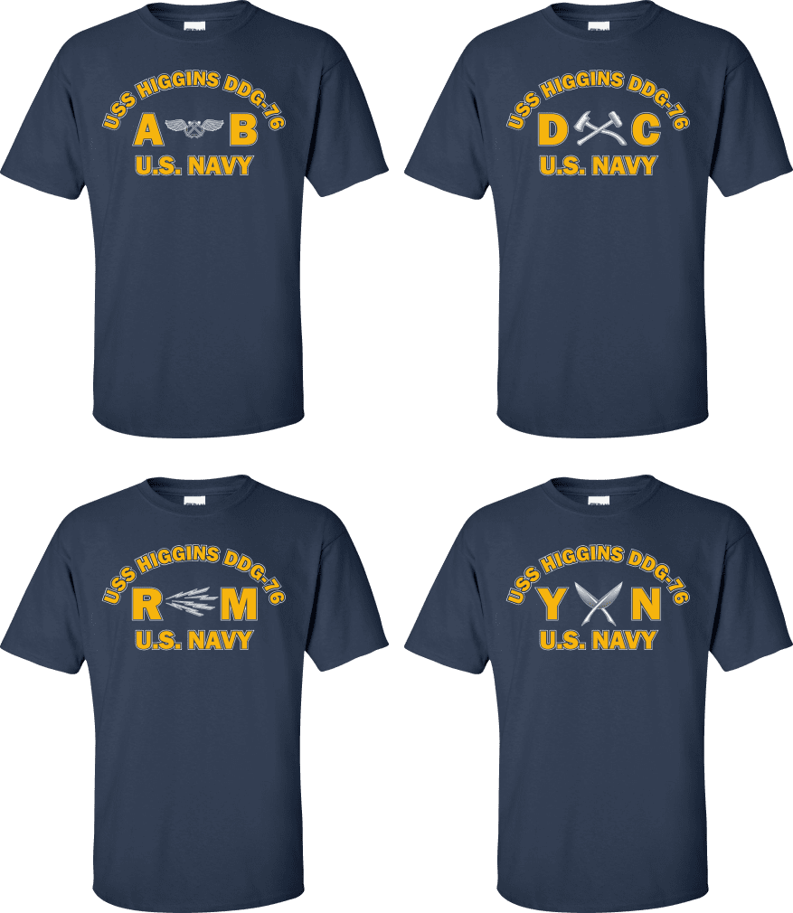 Due to disruptions in supply chains, this design will be embroidered on a Champion, Gildan, Jerzees or comparable brand.Proudly display your ship and rate with our top quality USS HIGGINS DDG-76 Rates t-shirts, sweatshirts, and hoodies. These fine U.S. Navy apparel items will make you the envy of your veteran buddies, or will make a fine gift! Our USS HIGGINS DDG-76 shirts are proudly printed in the USA!