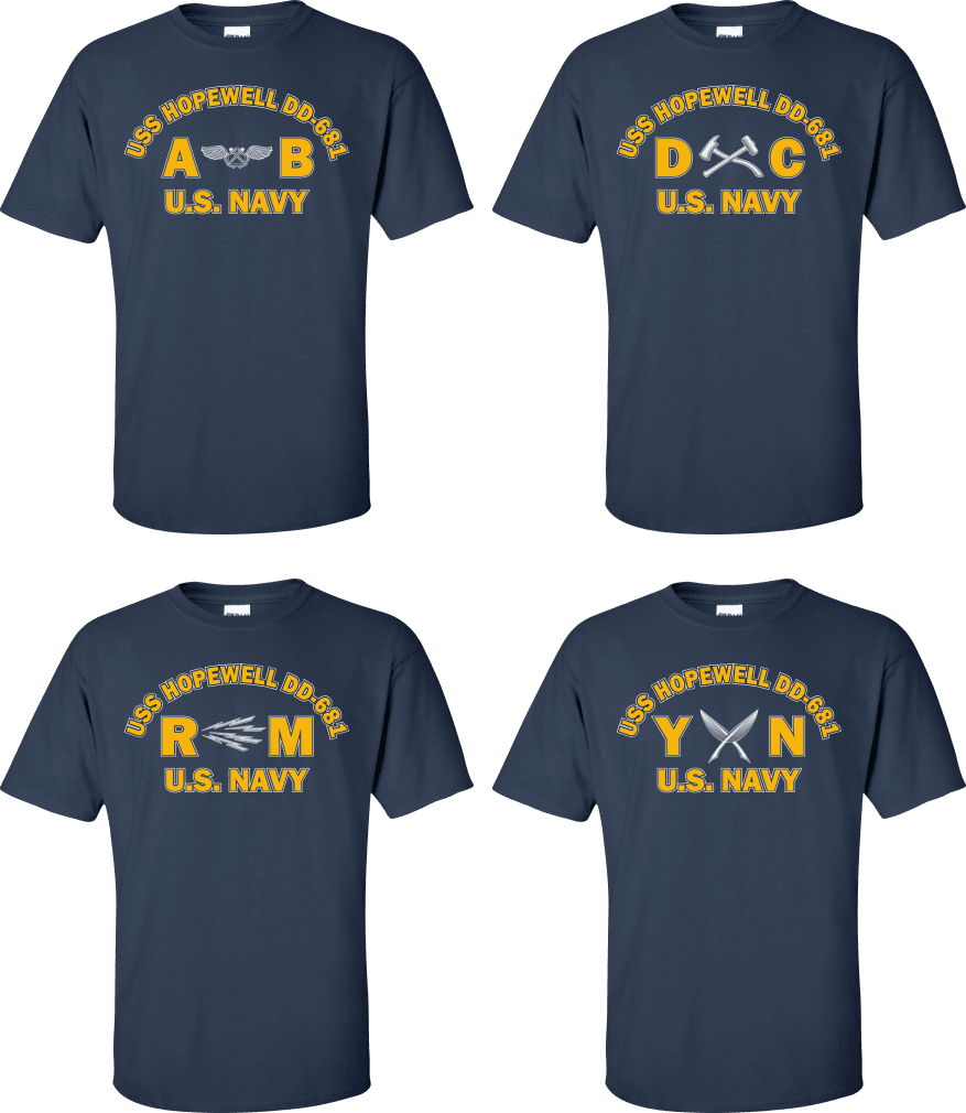 Due to disruptions in supply chains, this design will be embroidered on a Champion, Gildan, Jerzees or comparable brand.Proudly display your ship and rate with our top quality USS HOPEWELL DD-681 Rates t-shirts, sweatshirts, and hoodies. These fine U.S. Navy apparel items will make you the envy of your veteran buddies, or will make a fine gift! Our USS HOPEWELL DD-681 shirts are proudly printed in the USA!