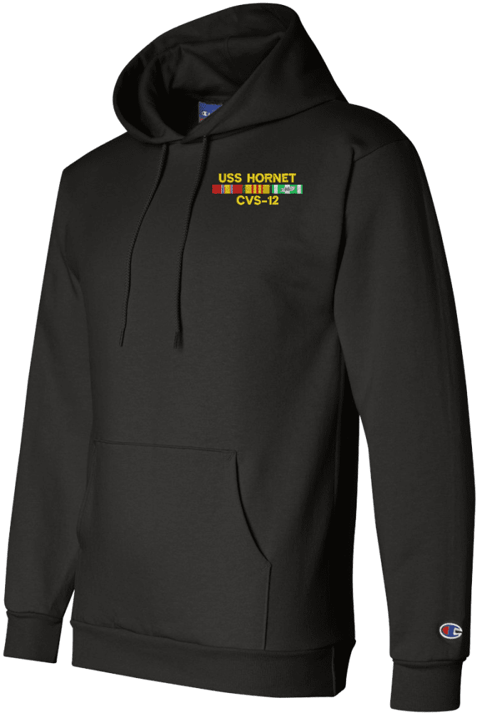 MilitaryBest has expanded its line of apparel with this custom embroidered USS Hornet CVS-12 with Vietnam Service Ribbons Hoodie. Each Hoodie is direct embroidered onto a Champion brand 9.5 oz 50/50 Cotton Poly blend. This Hoodie will make an excellent addition to your wardrobe, or a great gift. Your satisfaction is Guaranteed! This Hoodie is custom embroidered at our facilities in Scottsboro, AL.