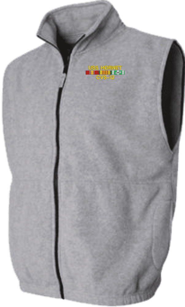 Due to supply chain disruptions, some colors and sizes may not be available in the same Brand, in these cases a brand of comparable quality will be used. Feel free to call in advance of your order, with questions you may have.MilitaryBest is proud to offer this quality USS Hornet CVS-12 with Vietnam Service Ribbons Fleece Vest. This Fleece Vest features a convertible collar with dyed-to-match zipper pull, oversized nylon reinforced slash pockets, and an elastic hem. It is made using a 100% anti-pill polyester Fleece Vest. This Fleece Vest will make an excellent addition to your wardrobe, or a quality gift. Your satisfaction is guaranteed! These Vests are custom embroidered at our facilities in Scottsboro, AL.