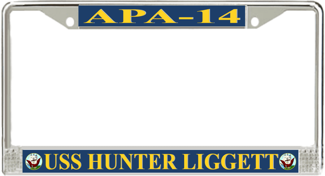 USS Hunter Liggett APA-14 License Plate FrameThis USS Hunter Liggett APA-14 License Plate Frame is proudly made in the USA at our facilities in Scottsboro, Alabama. Each of our MilitaryBest U.S. Navy Frames feature top and bottom Poly Coated Aluminum strips that are printed using sublimation which gives these quality automobile military frames a beautiful high gloss finish.