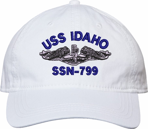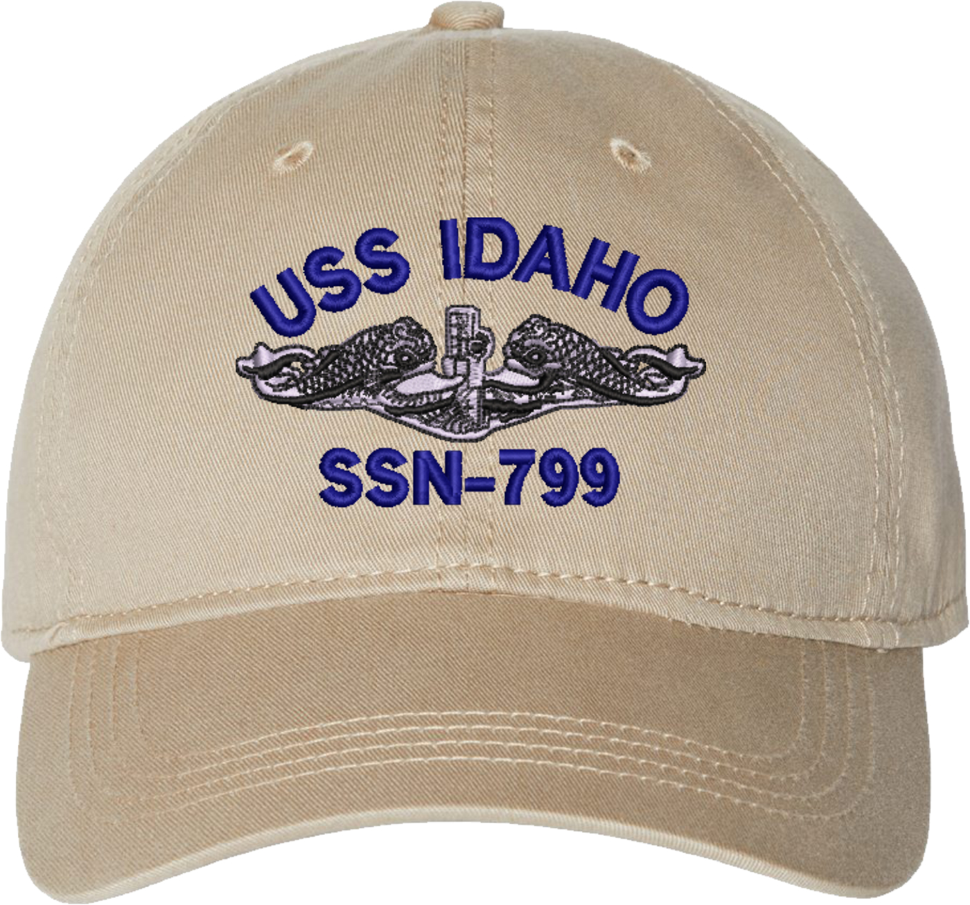 Show your Navy pride with this USS Idaho SSN-799 with Dolphins Unstructured Dad Cap from MilitaryBest. Crafted from 100% washed chino twill cotton, this six-panel, low-profile cap offers a relaxed and comfortable fit. Featuring high-quality embroidery done in our Scottsboro, Alabama facility, this cap is designed with a pre-curved visor and an adjustable tri-glide buckle closure for a perfect fit. Whether for everyday wear or as a meaningful gift, this cap is a great way to honor your own or a loved one's service.For caps ordered with custom embroidered personalized text please allow an additional 3 to 5 days production time. All custom back text will be embroidered in ALL CAPITAL LETTERS. Caps with back text or eggs are non-returnable unless there is a material defect in the cap.