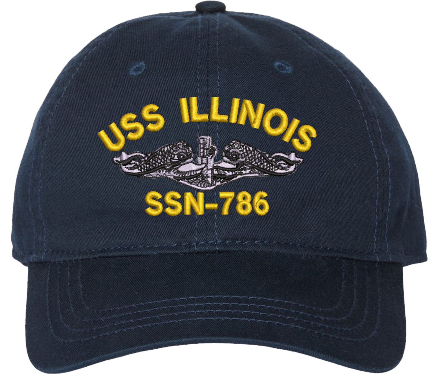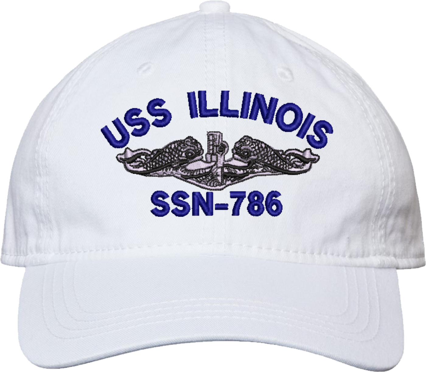 Show your Navy pride with this USS Illinois SSN-786 with Dolphins Unstructured Dad Cap from MilitaryBest. Crafted from 100% washed chino twill cotton, this six-panel, low-profile cap offers a relaxed and comfortable fit. Featuring high-quality embroidery done in our Scottsboro, Alabama facility, this cap is designed with a pre-curved visor and an adjustable tri-glide buckle closure for a perfect fit. Whether for everyday wear or as a meaningful gift, this cap is a great way to honor your own or a loved one's service.For caps ordered with custom embroidered personalized text please allow an additional 3 to 5 days production time. All custom back text will be embroidered in ALL CAPITAL LETTERS. Caps with back text or eggs are non-returnable unless there is a material defect in the cap.