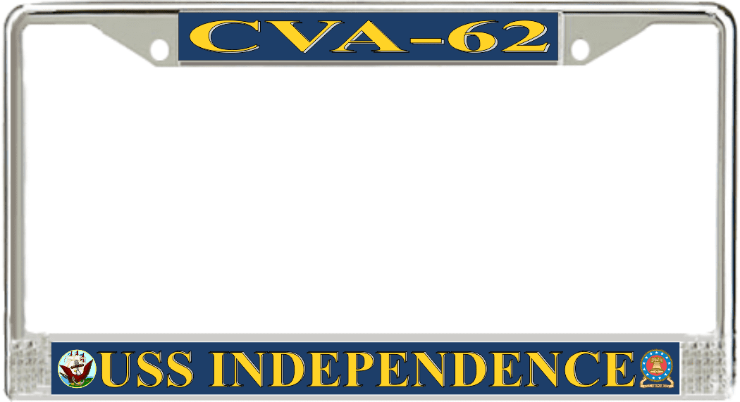 USS Independence CVA-62 License Plate FrameThis USS Independence CVA-62 License Plate Frame is proudly made in the USA at our facilities in Scottsboro, Alabama. Each of our MilitaryBest U.S. Navy Frames feature top and bottom Poly Coated Aluminum strips that are printed using sublimation which gives these quality automobile military frames a beautiful high gloss finish.