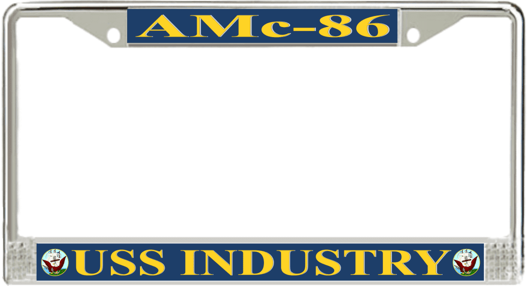 USS Industry AMc-86 License Plate FrameThis USS Industry AMc-86 License Plate Frame is proudly made in the USA at our facilities in Scottsboro, Alabama. Each of our MilitaryBest U.S. Navy Frames feature top and bottom Poly Coated Aluminum strips that are printed using sublimation which gives these quality automobile military frames a beautiful high gloss finish.