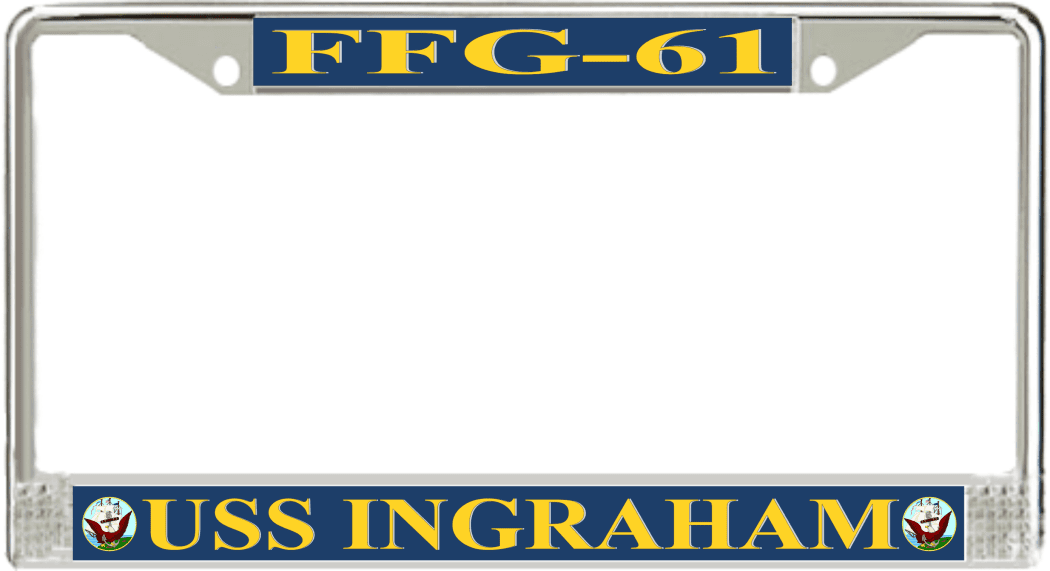 USS Ingraham FFG-61 License Plate FrameThis USS Ingraham FFG-61 License Plate Frame is proudly made in the USA at our facilities in Scottsboro, Alabama. Each of our MilitaryBest U.S. Navy Frames feature top and bottom Poly Coated Aluminum strips that are printed using sublimation which gives these quality automobile military frames a beautiful high gloss finish.