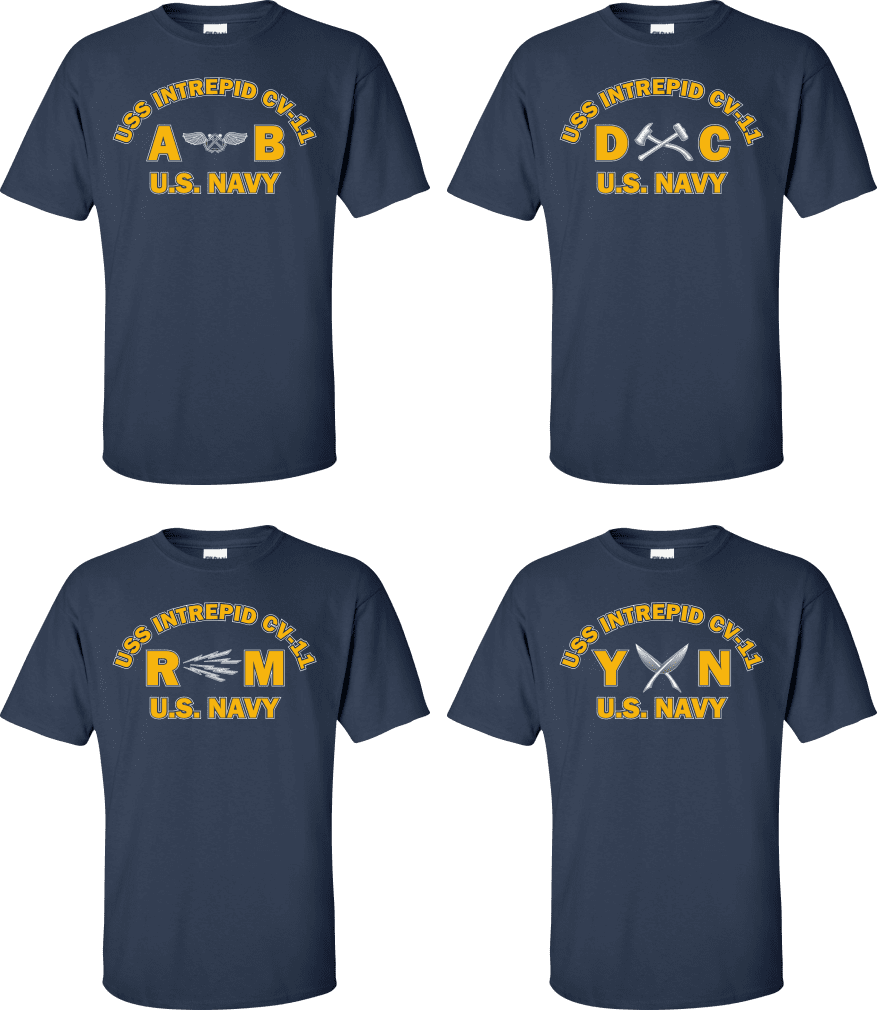 Due to disruptions in supply chains, this design will be embroidered on a Champion, Gildan, Jerzees or comparable brand.Proudly display your ship and rate with our top quality USS INTREPID CV-11 Rates t-shirts, sweatshirts, and hoodies. These fine U.S. Navy apparel items will make you the envy of your veteran buddies, or will make a fine gift! Our USS INTREPID CV-11 shirts are proudly printed in the USA!