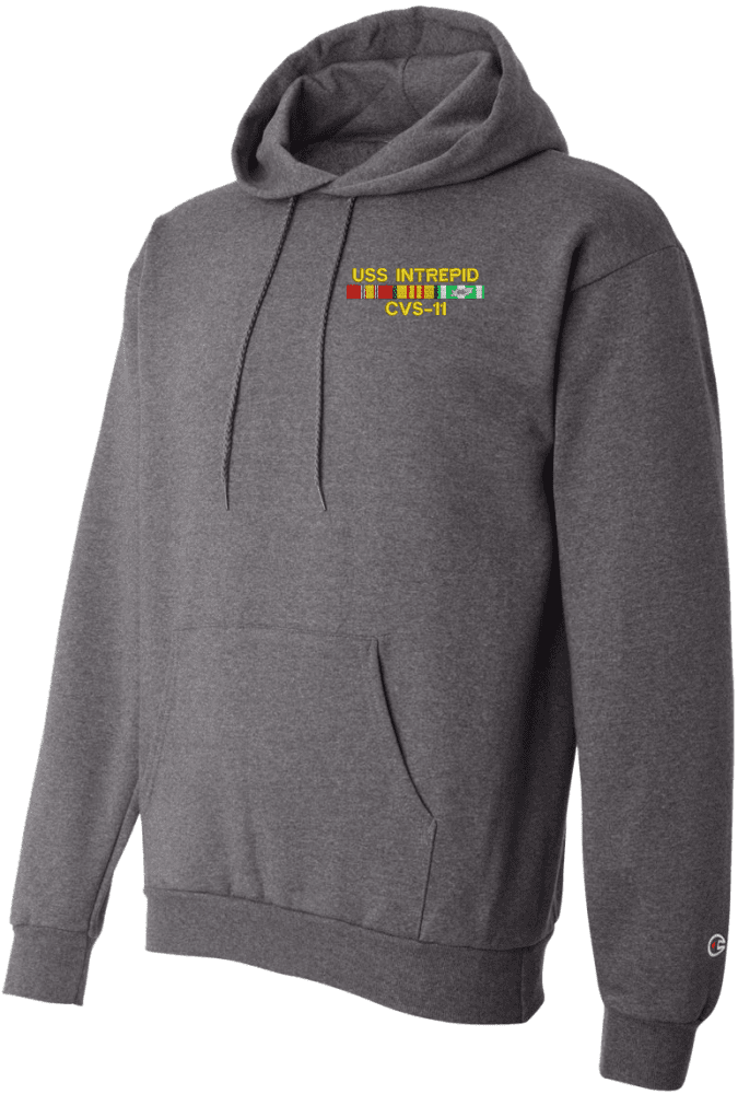 MilitaryBest has expanded its line of apparel with this custom embroidered USS Intrepid CVS-11 with Vietnam Service Ribbons Hoodie. Each Hoodie is direct embroidered onto a Champion brand 9.5 oz 50/50 Cotton Poly blend. This Hoodie will make an excellent addition to your wardrobe, or a great gift. Your satisfaction is Guaranteed! This Hoodie is custom embroidered at our facilities in Scottsboro, AL.