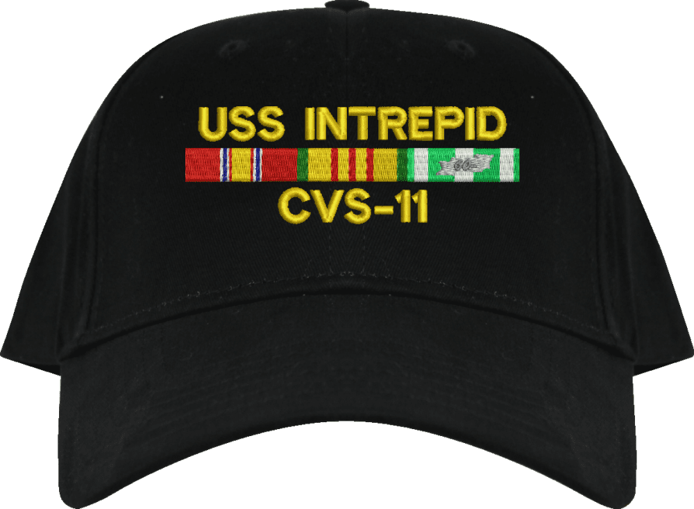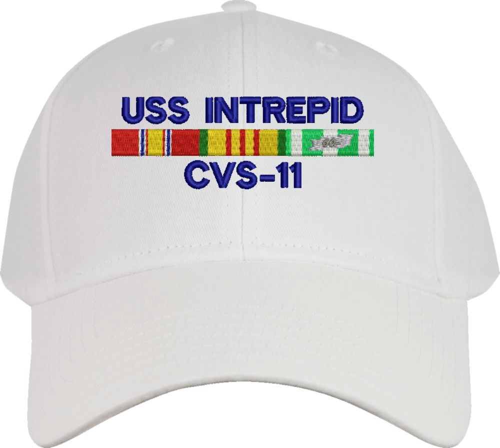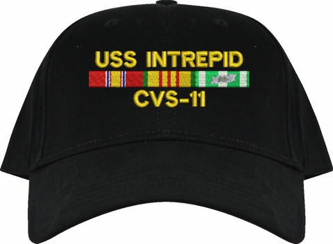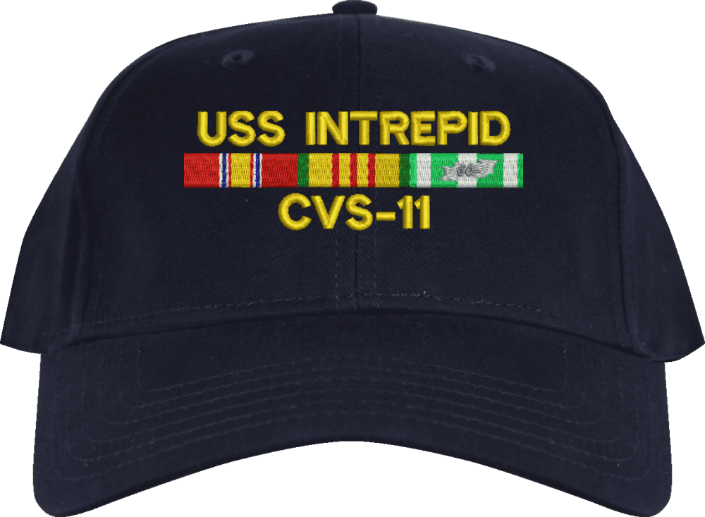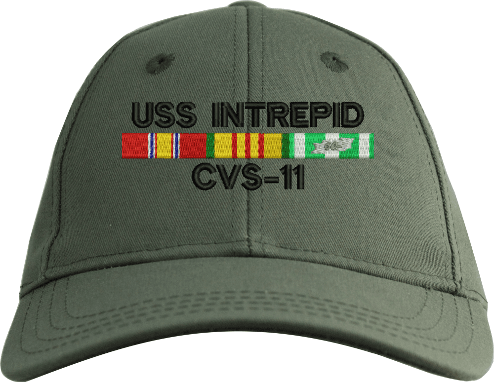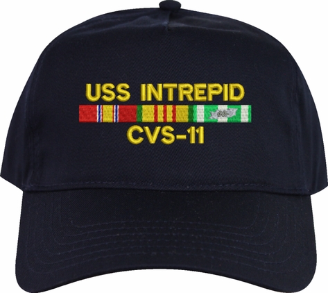 MilitaryBest is proud to offer this USS Intrepid CVS-11 with Vietnam Service Ribbons Embroidered Cap. This cap is available in a 5 panel high profile or 6 panel low profile styling. All our caps are made from top quality materials. This cap would make a wonderful addition to your collection or a great gift! All custom embroidery is done at our facility in Scottsboro, AL. *Caps ordered with embroidered back text requires an additional 1 to 2 days of production time. All personalized caps will be embroidered in ALL CAPITAL LETTERS. Caps personalized with back text are not returnable unless there is a material defect in the cap.A percentage of the sale of each MilitaryBest item is forwarded to the licensing departments of each respective branch of service in support of the MWR (Morale, Welfare, & Recreation) program. These payments are made by either ALL4U LLC or the wholesaler from where the item originated. Our team thanks you for your service and your support of these programs.