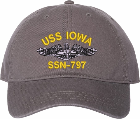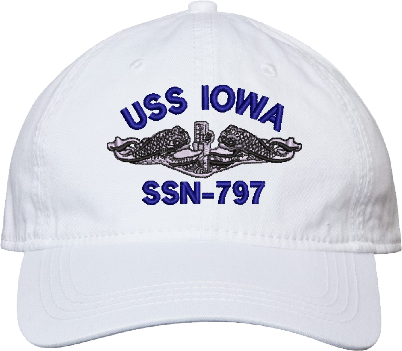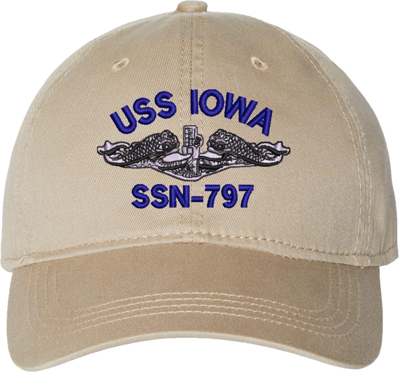 Show your Navy pride with this USS Iowa SSN-797 with Dolphins Unstructured Dad Cap from MilitaryBest. Crafted from 100% washed chino twill cotton, this six-panel, low-profile cap offers a relaxed and comfortable fit. Featuring high-quality embroidery done in our Scottsboro, Alabama facility, this cap is designed with a pre-curved visor and an adjustable tri-glide buckle closure for a perfect fit. Whether for everyday wear or as a meaningful gift, this cap is a great way to honor your own or a loved one's service.For caps ordered with custom embroidered personalized text please allow an additional 3 to 5 days production time. All custom back text will be embroidered in ALL CAPITAL LETTERS. Caps with back text or eggs are non-returnable unless there is a material defect in the cap.