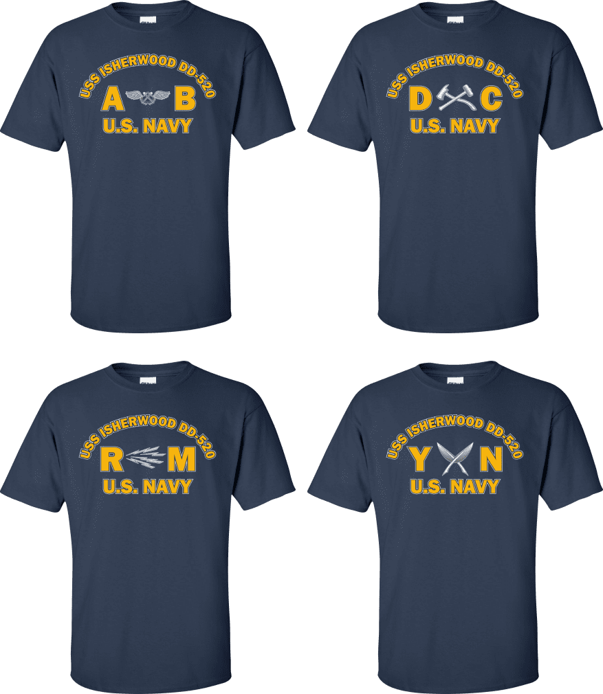 Due to disruptions in supply chains, this design will be embroidered on a Champion, Gildan, Jerzees or comparable brand.Proudly display your ship and rate with our top quality USS ISHERWOOD DD-520 Rates t-shirts, sweatshirts, and hoodies. These fine U.S. Navy apparel items will make you the envy of your veteran buddies, or will make a fine gift! Our USS ISHERWOOD DD-520 shirts are proudly printed in the USA!