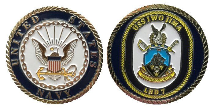 This USS Iwo Jima Challenge Coin Enlisted measures 1-3/4 inches and is made from a bronze alloy with a brilliantly colored nickel finish. This Challenge Coin would make a wonderful addition to your collection or a great gift. Its quality is guaranteed.Does NOT Fit in Acrylic Single 1 5/8" Challenge Coin Display Case
