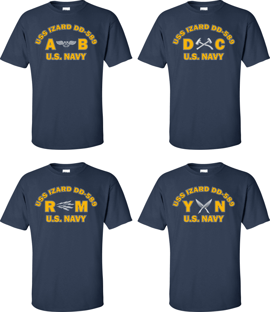 Due to disruptions in supply chains, this design will be embroidered on a Champion, Gildan, Jerzees or comparable brand.Proudly display your ship and rate with our top quality USS IZARD DD-589 Rates t-shirts, sweatshirts, and hoodies. These fine U.S. Navy apparel items will make you the envy of your veteran buddies, or will make a fine gift! Our USS IZARD DD-589 shirts are proudly printed in the USA!