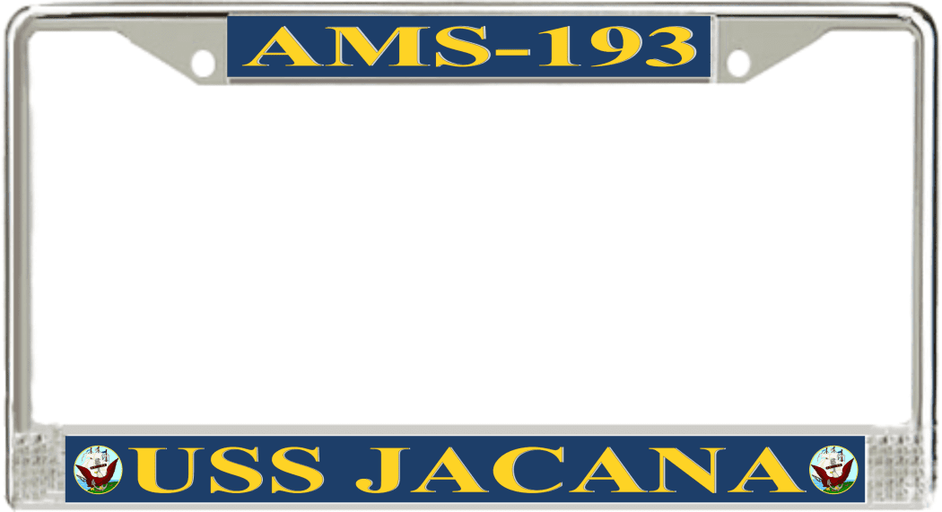 USS Jacana AMS-193 License Plate Frame This USS Jacana AMS-193 License Plate Frame is proudly made in the USA at our facilities in Scottsboro, Alabama. Each Frame features top and bottom sublimated design strips that are poly coated for a protective gloss finish. Please check your state and local regulations for compatibility of these frames for use on your vehicle.