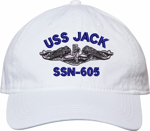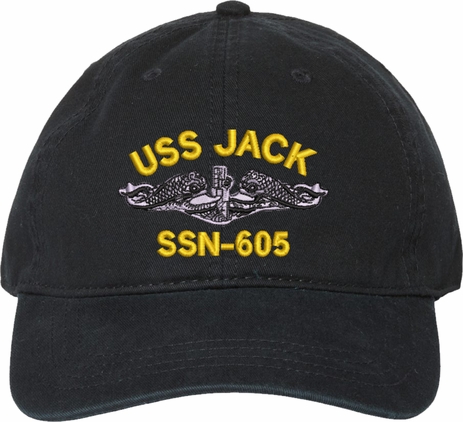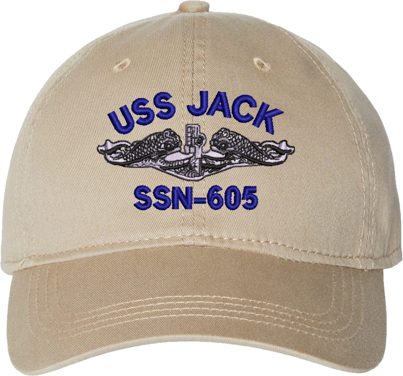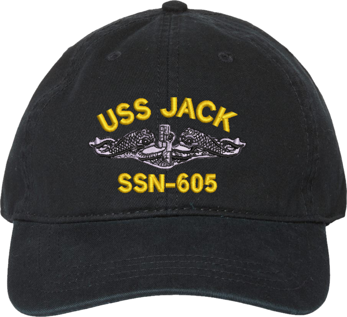 Show your Navy pride with this USS Jack SSN-605 with Dolphins Unstructured Dad Cap from MilitaryBest. Crafted from 100% washed chino twill cotton, this six-panel, low-profile cap offers a relaxed and comfortable fit. Featuring high-quality embroidery done in our Scottsboro, Alabama facility, this cap is designed with a pre-curved visor and an adjustable tri-glide buckle closure for a perfect fit. Whether for everyday wear or as a meaningful gift, this cap is a great way to honor your own or a loved one's service.For caps ordered with custom embroidered personalized text please allow an additional 3 to 5 days production time. All custom back text will be embroidered in ALL CAPITAL LETTERS. Caps with back text or eggs are non-returnable unless there is a material defect in the cap.