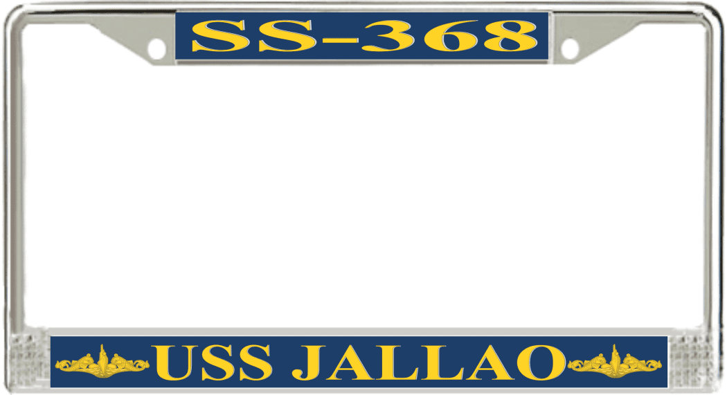 USS Jallao SS-368 License Plate Frame This USS Jallao SS-368 License Plate Frame is proudly made in the USA at our facilities in Scottsboro, Alabama. Each Frame features top and bottom sublimated design strips that are poly coated for a protective gloss finish. Please check your state and local regulations for compatibility of these frames for use on your vehicle.