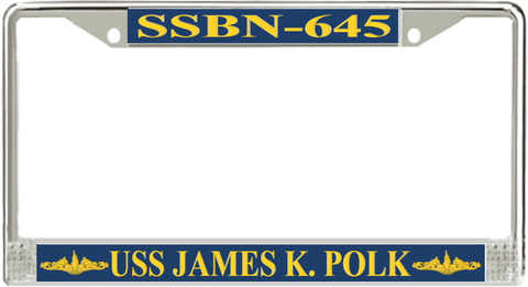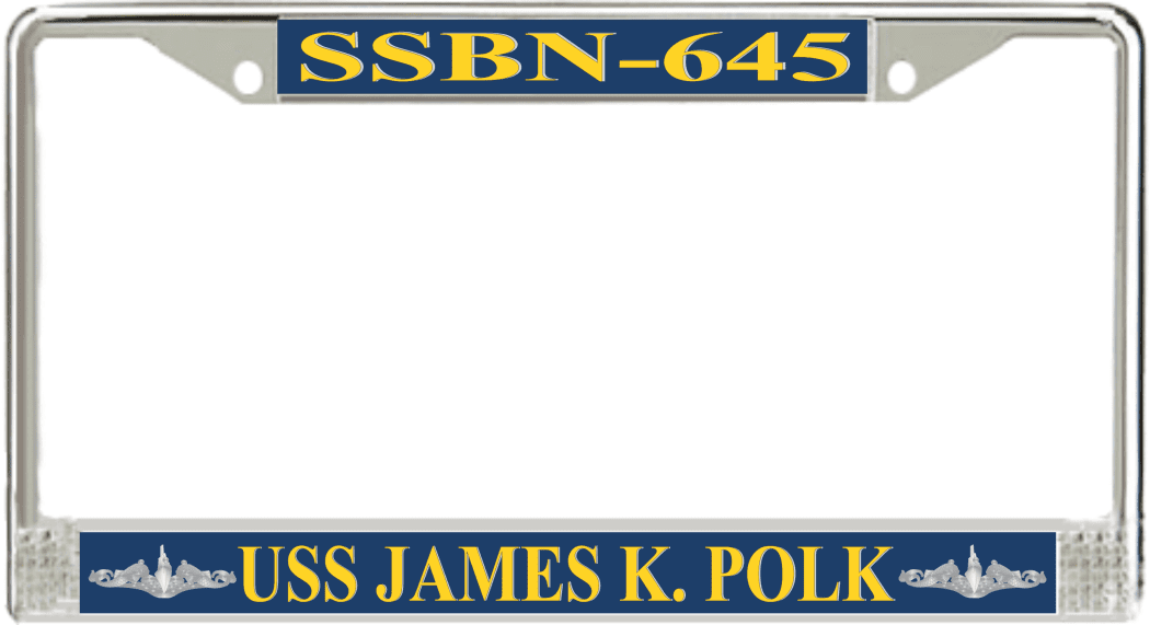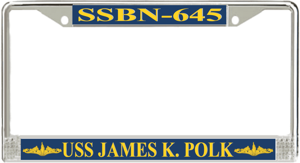 USS James K. Polk SSBN-645 License Plate Frame This USS James K. Polk SSBN-645 License Plate Frame is proudly made in the USA at our facilities in Scottsboro, Alabama. Each Frame features top and bottom sublimated design strips that are poly coated for a protective gloss finish. Please check your state and local regulations for compatibility of these frames for use on your vehicle.