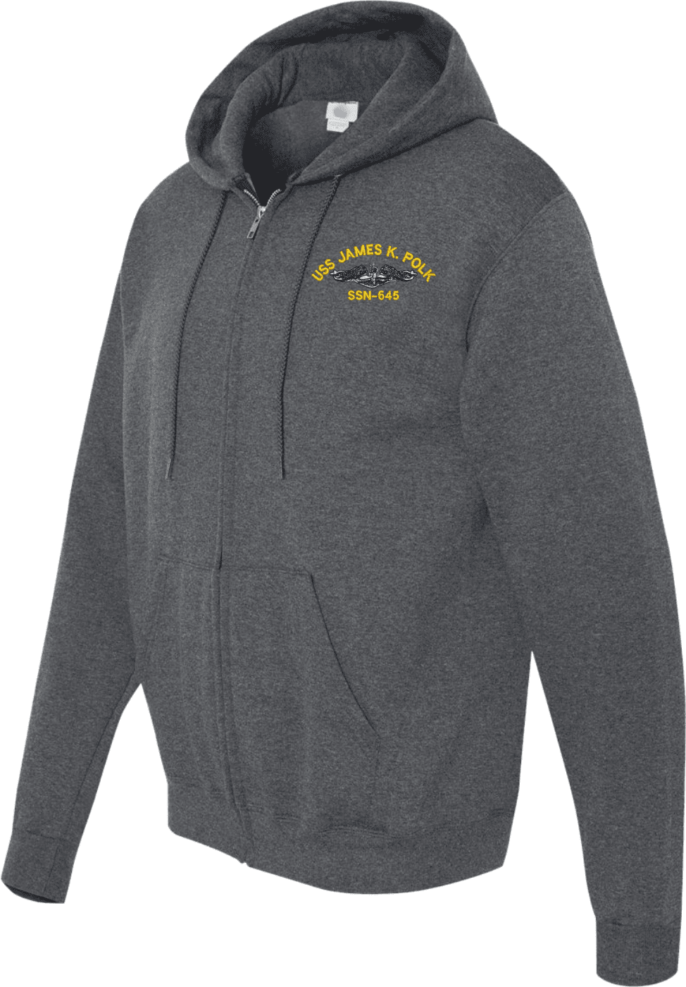 MilitaryBest has expanded its line of apparel with this custom embroidered USS James K Polk SSN-645 with Dolphins Embroidered Zippered Hoodie. Each Hoodie is direct embroidered onto a Champion brand 9.5 oz 50/50 Cotton Poly blend. This will make an excellent addition to your wardrobe, or a great gift. Your satisfaction is Guaranteed! These quality zippered hoodies are proudly embroidered at our facilities in Scottsboro, AL. Support the Army MWR program by purchasing only from Licensed Vendors.