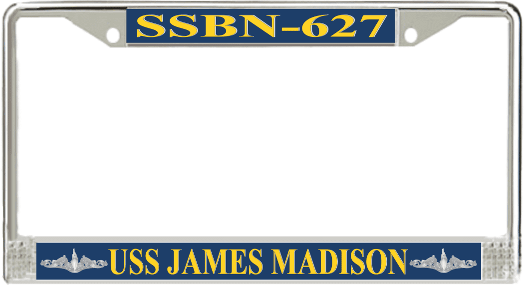 USS James Madison SSBN-627 License Plate Frame This USS James Madison SSBN-627 License Plate Frame is proudly made in the USA at our facilities in Scottsboro, Alabama. Each Frame features top and bottom sublimated design strips that are poly coated for a protective gloss finish. Please check your state and local regulations for compatibility of these frames for use on your vehicle.