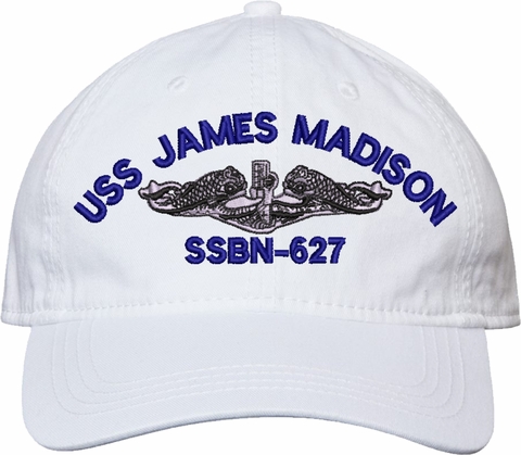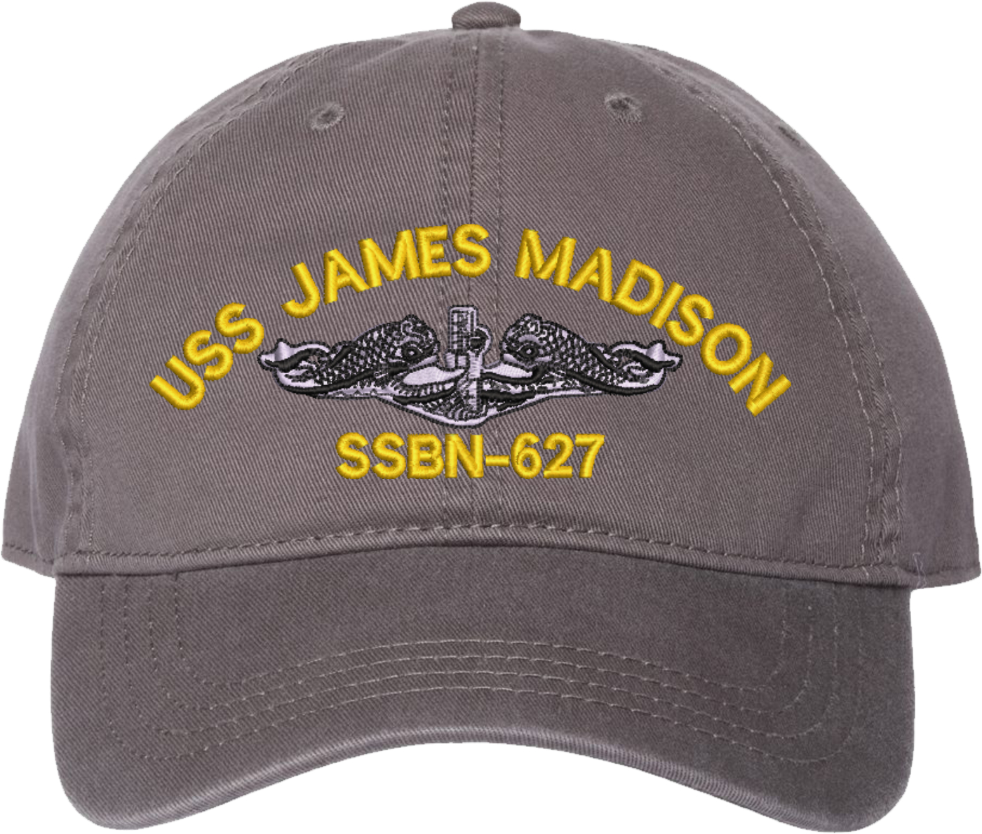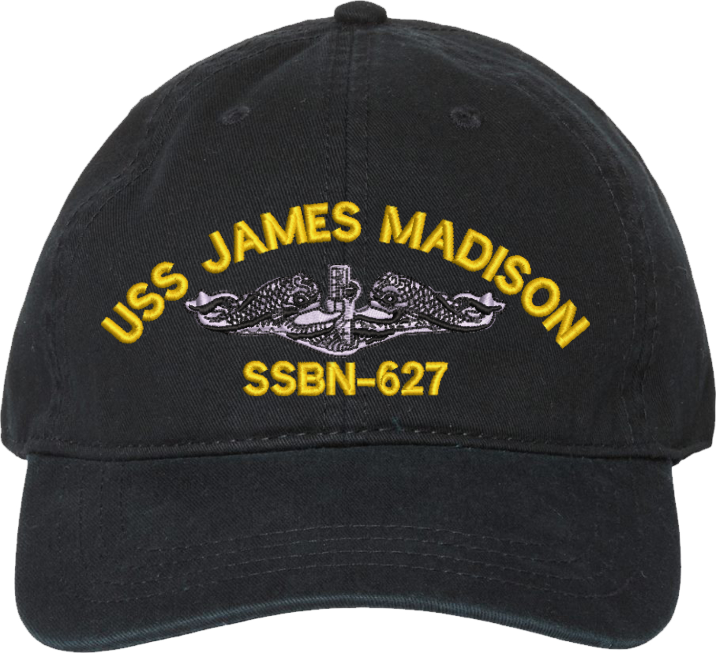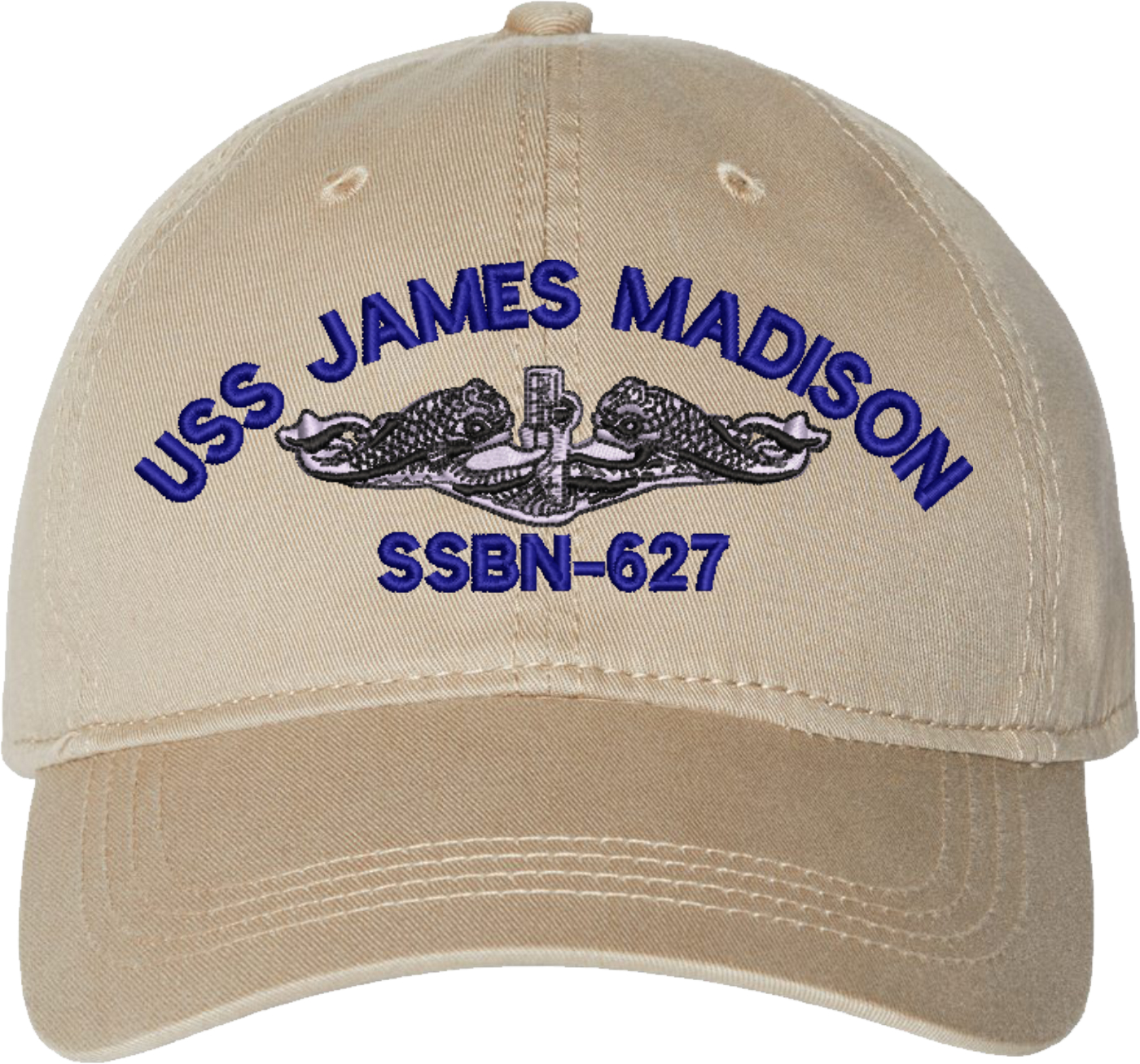 Show your Navy pride with this USS James Madison SSBN-627 with Dolphins Unstructured Dad Cap from MilitaryBest. Crafted from 100% washed chino twill cotton, this six-panel, low-profile cap offers a relaxed and comfortable fit. Featuring high-quality embroidery done in our Scottsboro, Alabama facility, this cap is designed with a pre-curved visor and an adjustable tri-glide buckle closure for a perfect fit. Whether for everyday wear or as a meaningful gift, this cap is a great way to honor your own or a loved one's service.For caps ordered with custom embroidered personalized text please allow an additional 3 to 5 days production time. All custom back text will be embroidered in ALL CAPITAL LETTERS. Caps with back text or eggs are non-returnable unless there is a material defect in the cap.