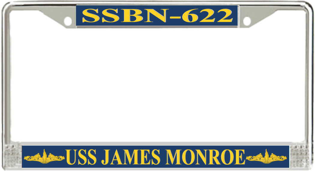 USS James Monroe SSBN-622 License Plate Frame This USS James Monroe SSBN-622 License Plate Frame is proudly made in the USA at our facilities in Scottsboro, Alabama. Each Frame features top and bottom sublimated design strips that are poly coated for a protective gloss finish. Please check your state and local regulations for compatibility of these frames for use on your vehicle.