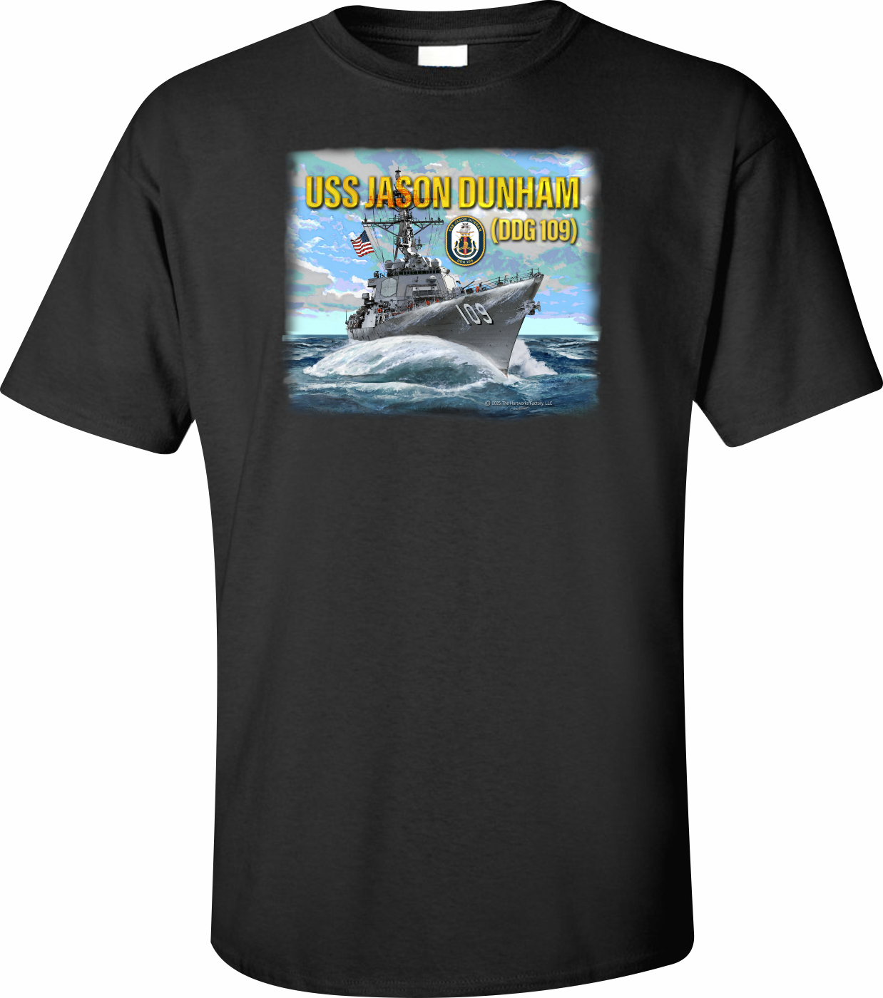 MilitaryBest is proud to offer this fine USS Jason Dunham DDG-109 Printed Art T-Shirt. This shirt features a full front print, with beautiful artwork designed by licensed Navy artist David Hart. This shirt is available in black and navy blue colors. Each T-shirt is proudly printed in the USA.Unless there is a defect in workmanship or material, these shirts are unreturnable.
