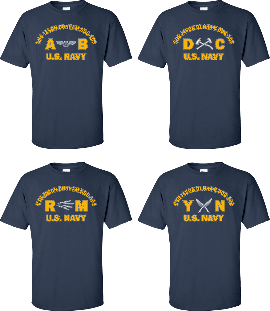 Due to disruptions in supply chains, this design will be embroidered on a Champion, Gildan, Jerzees or comparable brand.Proudly display your ship and rate with our top quality USS JASON DUNHAM DDG-109 Rates t-shirts, sweatshirts, and hoodies. These fine U.S. Navy apparel items will make you the envy of your veteran buddies, or will make a fine gift! Our USS JASON DUNHAM DDG-109 shirts are proudly printed in the USA!