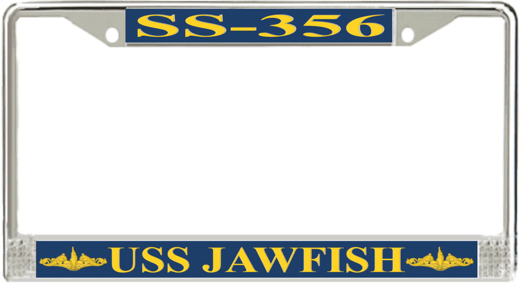 USS Jawfish SS-356 License Plate Frame This USS Jawfish SS-356 License Plate Frame is proudly made in the USA at our facilities in Scottsboro, Alabama. Each Frame features top and bottom sublimated design strips that are poly coated for a protective gloss finish. Please check your state and local regulations for compatibility of these frames for use on your vehicle.