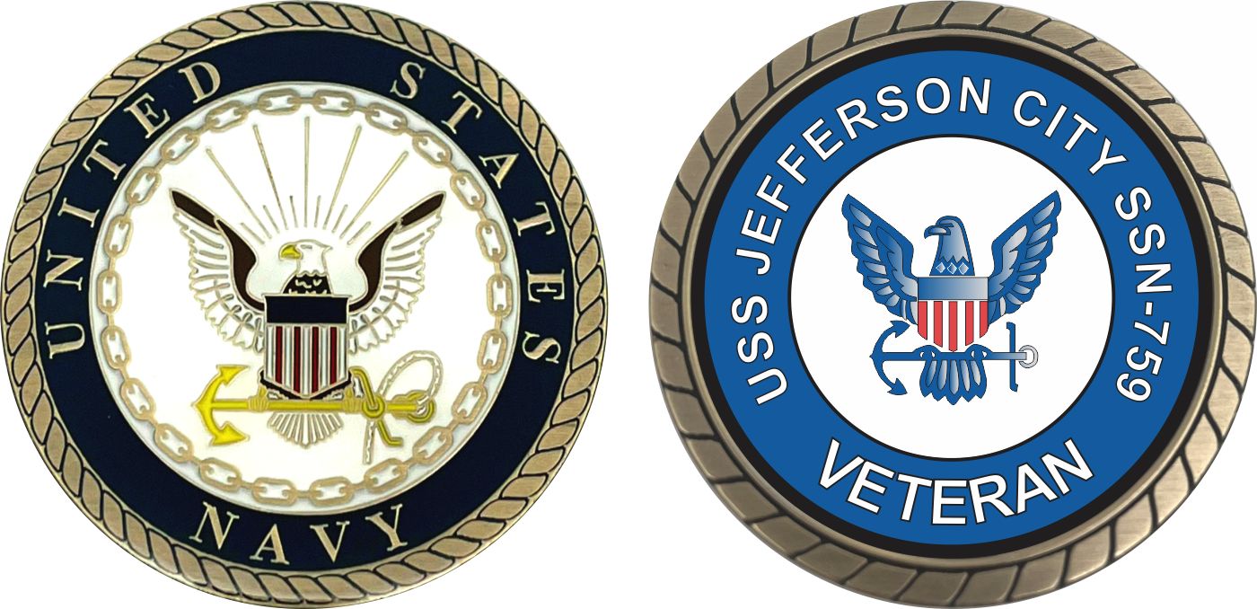 This 1 3/4” USS Jefferson City SSN-753 Veteran Challenge Coin is proudly offered by MilitaryBest. This Officially Licensed Navy coin has beautiful enamel finish on one side and an organized crisp clean USS Jefferson City SSN-753 Veteran design on the opposite side.