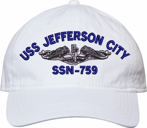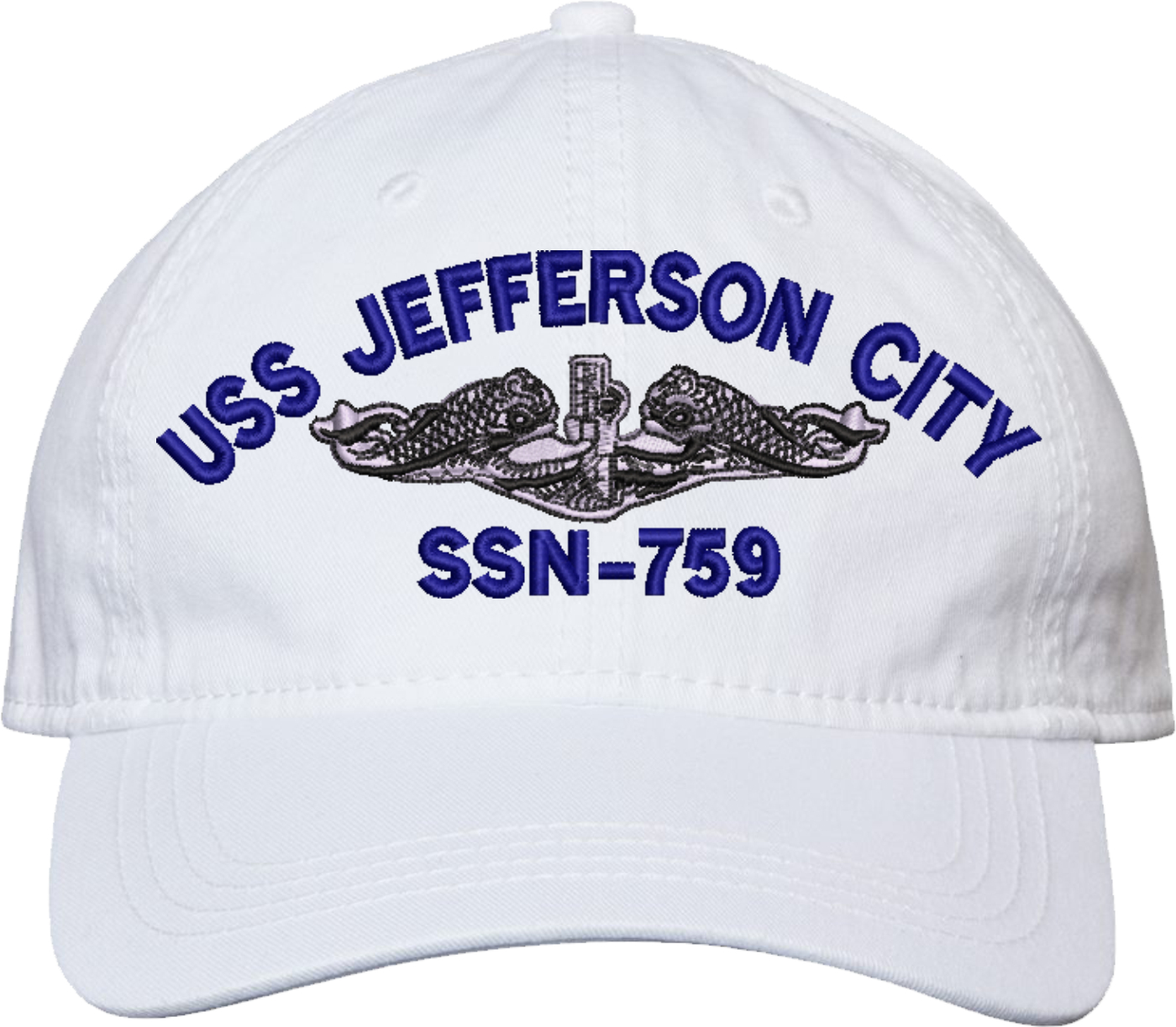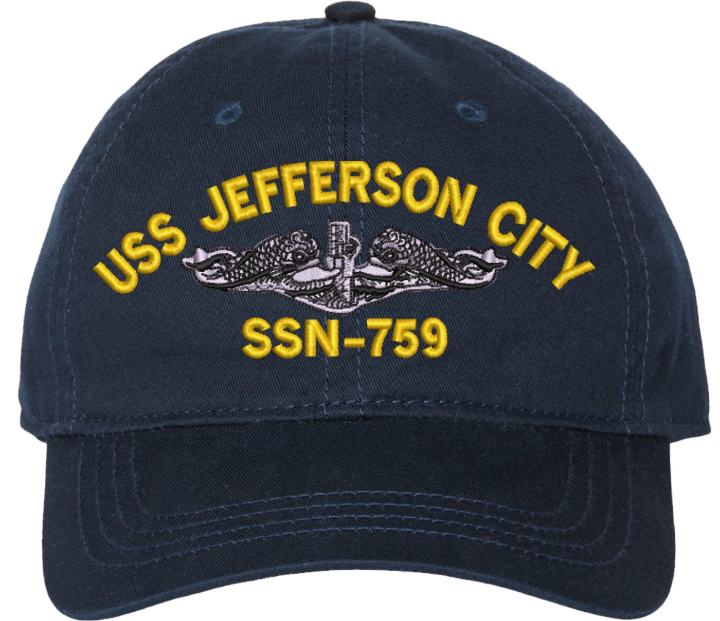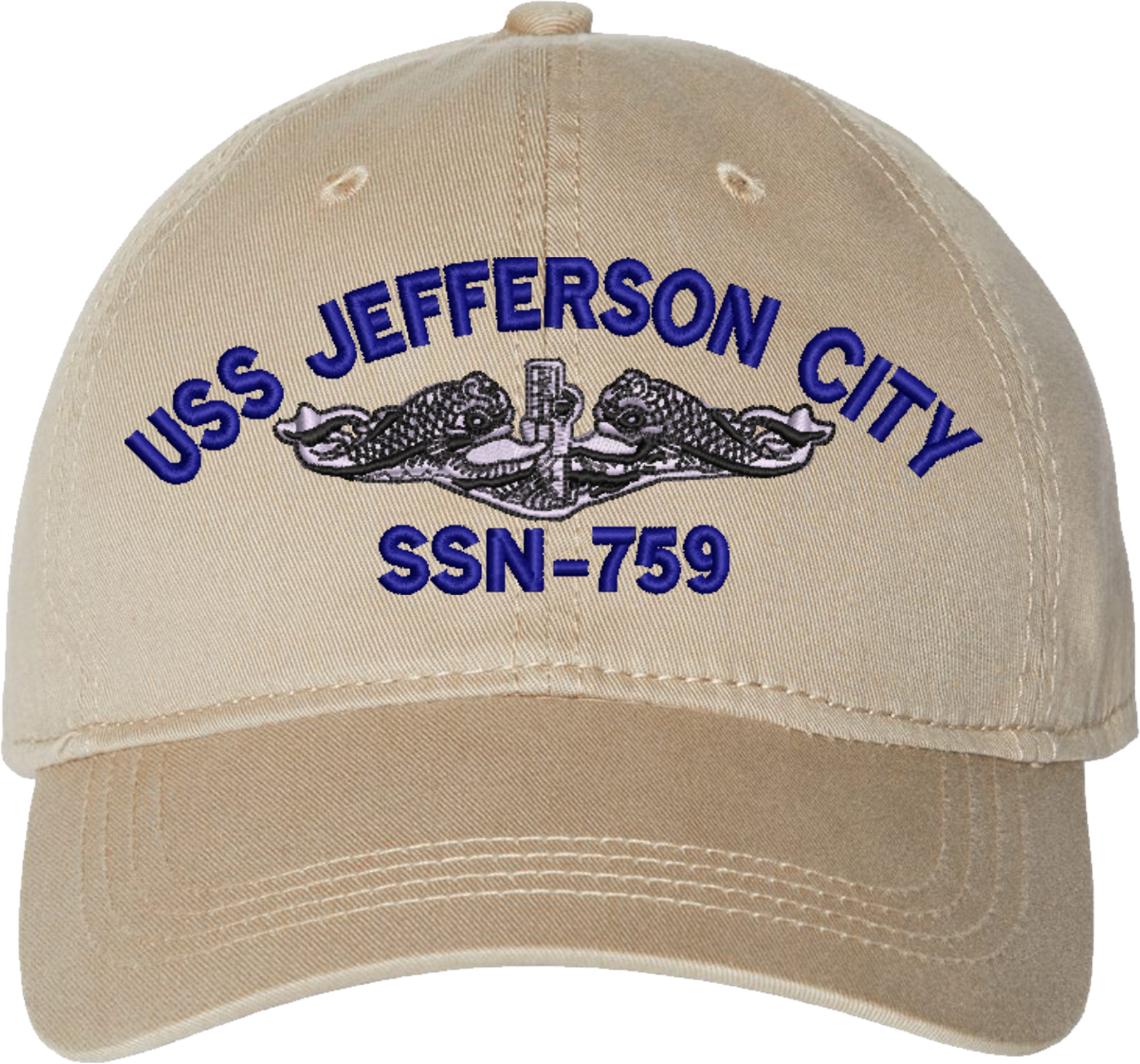Show your Navy pride with this USS Jefferson City SSN-759 with Dolphins Unstructured Dad Cap from MilitaryBest. Crafted from 100% washed chino twill cotton, this six-panel, low-profile cap offers a relaxed and comfortable fit. Featuring high-quality embroidery done in our Scottsboro, Alabama facility, this cap is designed with a pre-curved visor and an adjustable tri-glide buckle closure for a perfect fit. Whether for everyday wear or as a meaningful gift, this cap is a great way to honor your own or a loved one's service.For caps ordered with custom embroidered personalized text please allow an additional 3 to 5 days production time. All custom back text will be embroidered in ALL CAPITAL LETTERS. Caps with back text or eggs are non-returnable unless there is a material defect in the cap.
