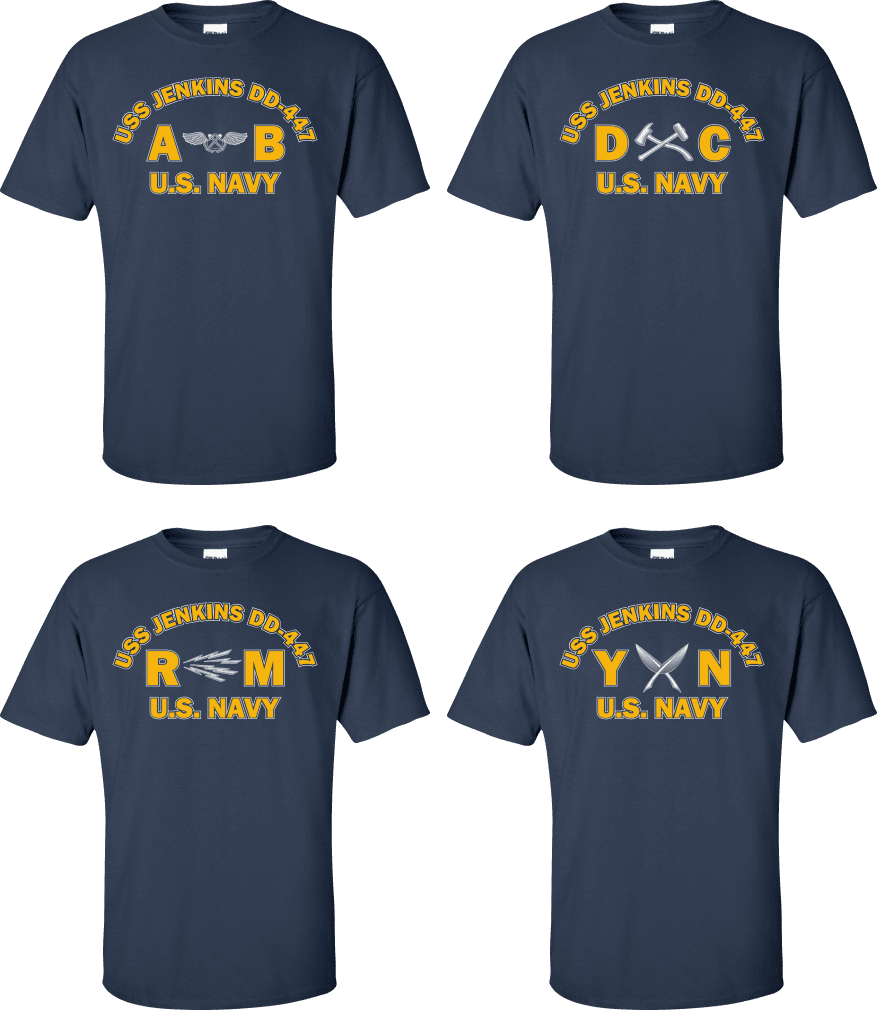 Due to disruptions in supply chains, this design will be embroidered on a Champion, Gildan, Jerzees or comparable brand.Proudly display your ship and rate with our top quality USS JENKINS DD-447 Rates t-shirts, sweatshirts, and hoodies. These fine U.S. Navy apparel items will make you the envy of your veteran buddies, or will make a fine gift! Our USS JENKINS DD-447 shirts are proudly printed in the USA!
