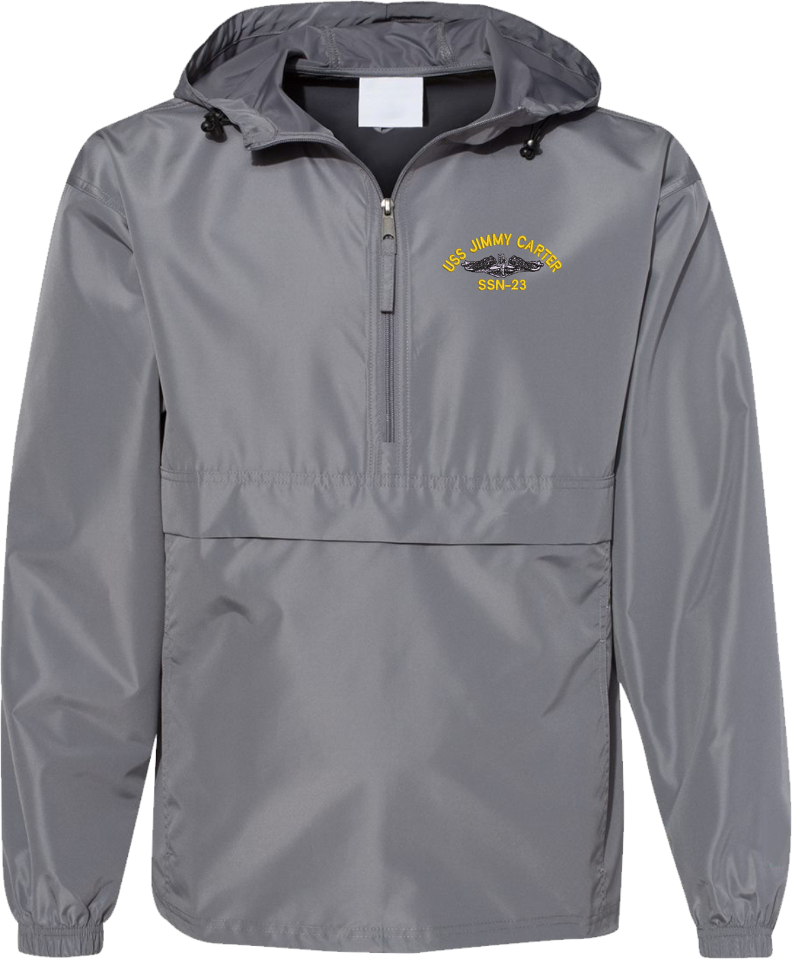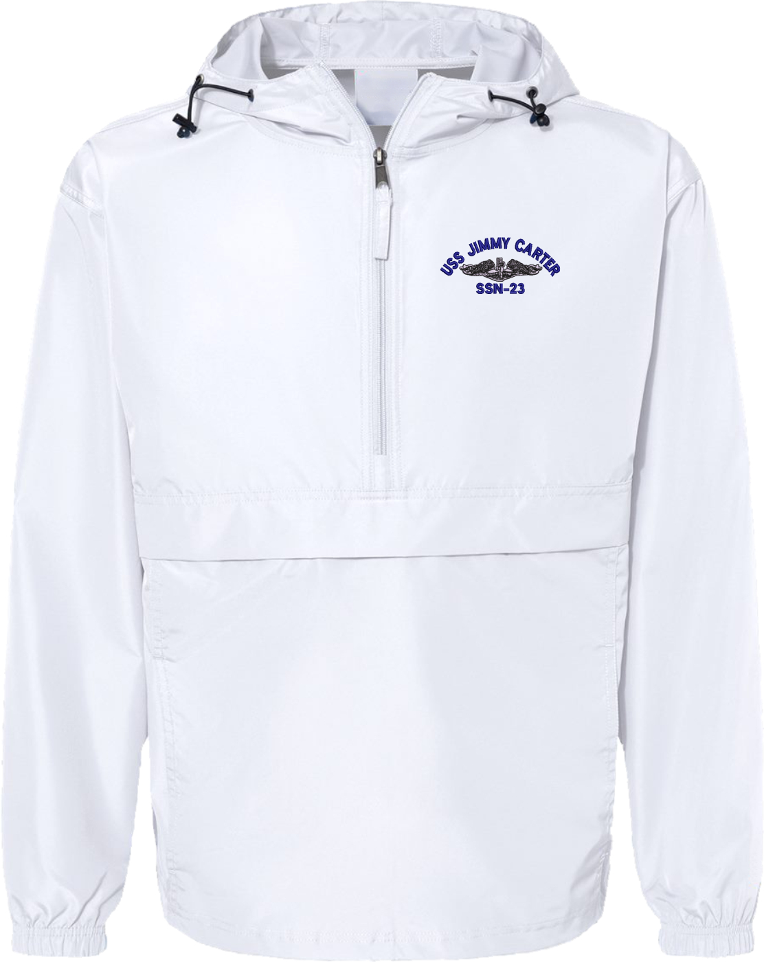 MilitaryBest is proud to offer this quality USS Jimmy Carter SSN-23 with Dolphins Hooded Windbreaker. Also known as an Anorak Jacket, this windbreaker is designed to keep wind and water out. With a design embroidered over the left chest, this windbreaker is embroidered to order at our facilities in Scottsboro, AL.. This windbreaker can be packed into the mesh lined pouch pocket for a more portable method of storage.- 100% Polyester