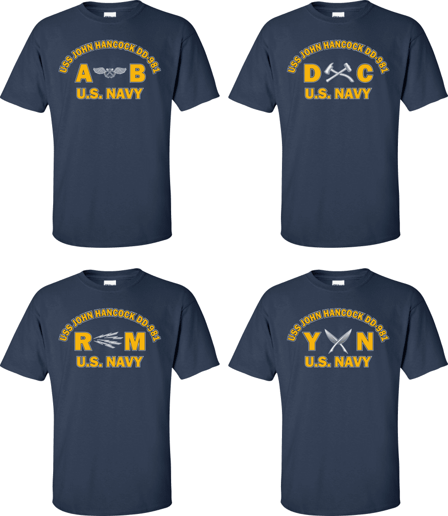 Due to disruptions in supply chains, this design will be embroidered on a Champion, Gildan, Jerzees or comparable brand.Proudly display your ship and rate with our top quality USS JOHN HANCOCK DD-981 Rates t-shirts, sweatshirts, and hoodies. These fine U.S. Navy apparel items will make you the envy of your veteran buddies, or will make a fine gift! Our USS JOHN HANCOCK DD-981 shirts are proudly printed in the USA!