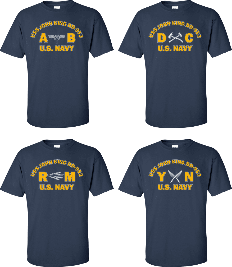 Due to disruptions in supply chains, this design will be embroidered on a Champion, Gildan, Jerzees or comparable brand.Proudly display your ship and rate with our top quality USS JOHN KING DD-953 Rates t-shirts, sweatshirts, and hoodies. These fine U.S. Navy apparel items will make you the envy of your veteran buddies, or will make a fine gift! Our USS JOHN KING DD-953 shirts are proudly printed in the USA!