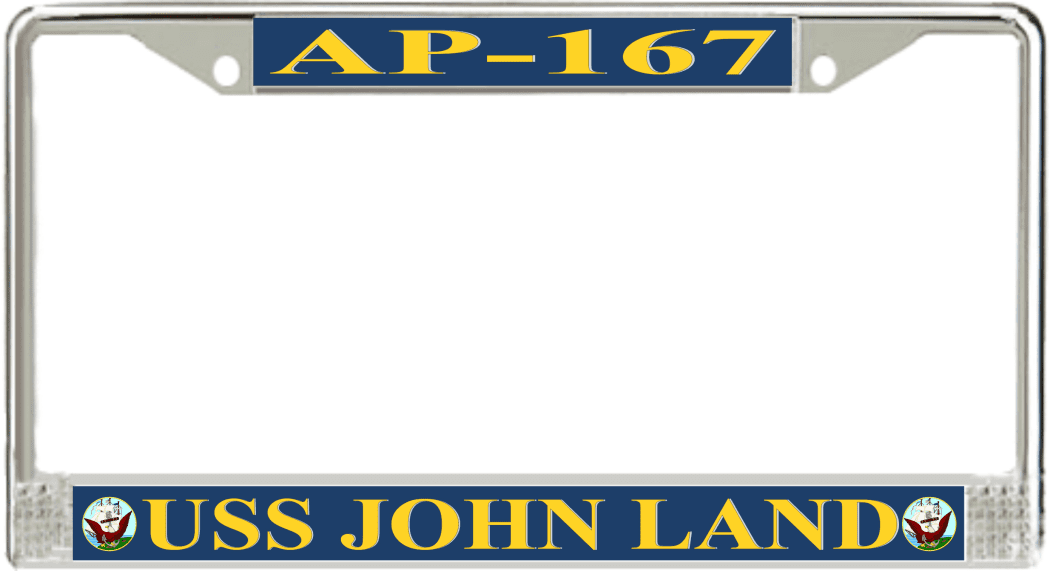 USS John Land AP-167 License Plate FrameThis USS John Land AP-167 License Plate Frame is proudly made in the USA at our facilities in Scottsboro, Alabama. Each of our MilitaryBest U.S. Navy Frames feature top and bottom Poly Coated Aluminum strips that are printed using sublimation which gives these quality automobile military frames a beautiful high gloss finish.