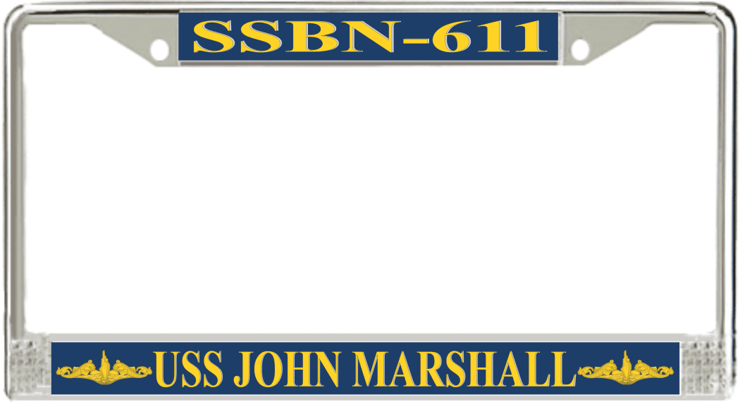 USS John Marshall SSBN-611 License Plate Frame This USS John Marshall SSBN-611 License Plate Frame is proudly made in the USA at our facilities in Scottsboro, Alabama. Each Frame features top and bottom sublimated design strips that are poly coated for a protective gloss finish. Please check your state and local regulations for compatibility of these frames for use on your vehicle.