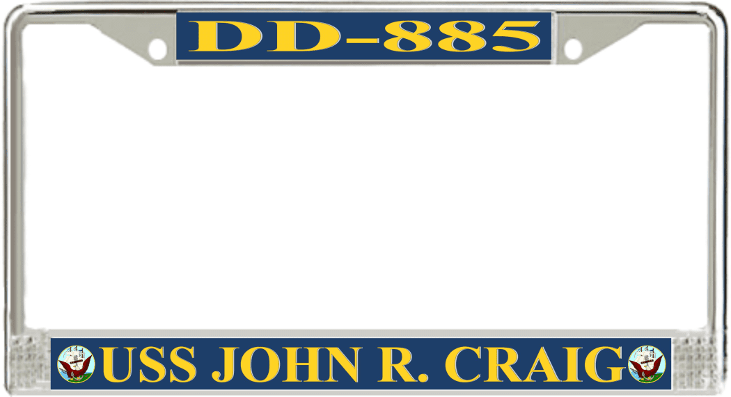 USS John R. Craig DD-885 License Plate FrameThis USS John R. Craig DD-885 License Plate Frame is proudly made in the USA at our facilities in Scottsboro, Alabama. Each of our MilitaryBest U.S. Navy Frames feature top and bottom Poly Coated Aluminum strips that are printed using sublimation which gives these quality automobile military frames a beautiful high gloss finish.