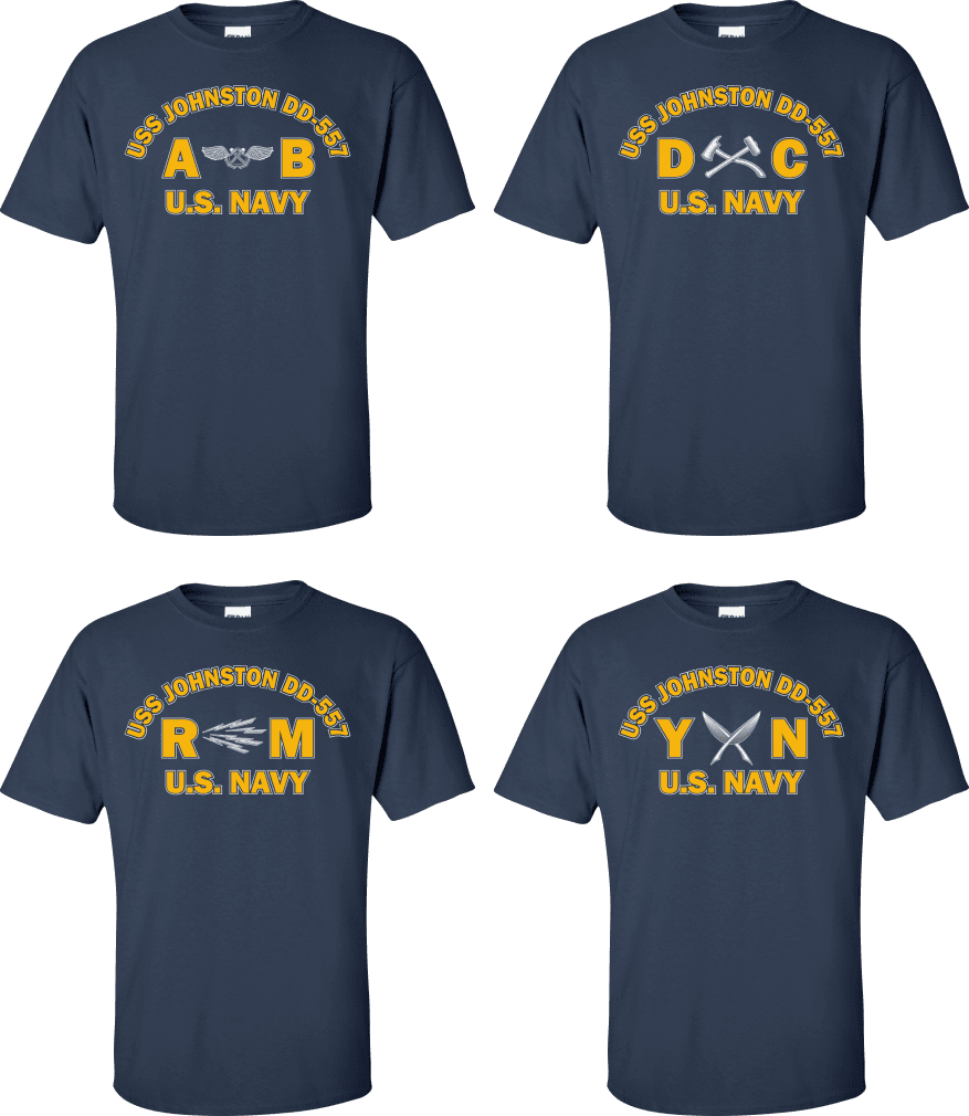 Due to disruptions in supply chains, this design will be embroidered on a Champion, Gildan, Jerzees or comparable brand.Proudly display your ship and rate with our top quality USS JOHNSTON DD-557 Rates t-shirts, sweatshirts, and hoodies. These fine U.S. Navy apparel items will make you the envy of your veteran buddies, or will make a fine gift! Our USS JOHNSTON DD-557 shirts are proudly printed in the USA!