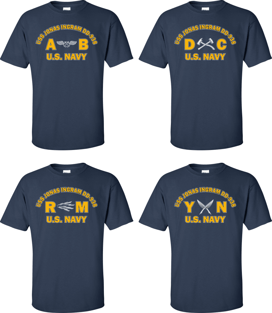 Due to disruptions in supply chains, this design will be embroidered on a Champion, Gildan, Jerzees or comparable brand.Proudly display your ship and rate with our top quality USS JONAS INGRAM DD-938 Rates t-shirts, sweatshirts, and hoodies. These fine U.S. Navy apparel items will make you the envy of your veteran buddies, or will make a fine gift! Our USS JONAS INGRAM DD-938 shirts are proudly printed in the USA!