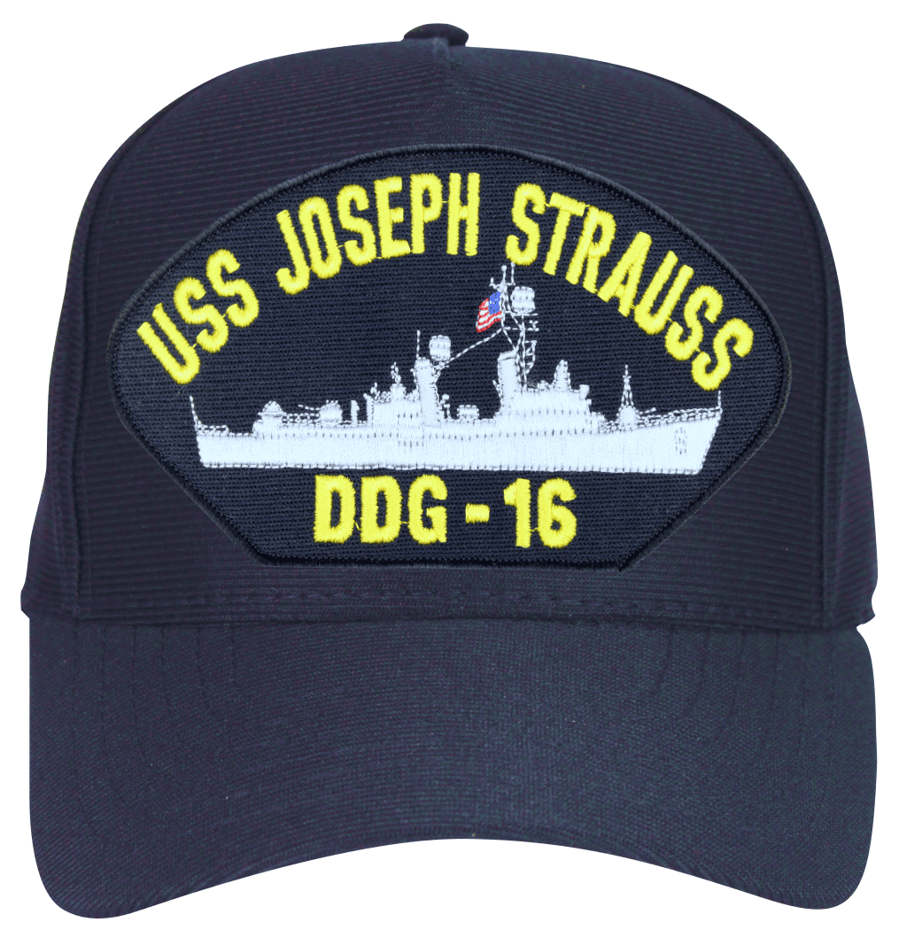 This USS Joseph Strauss DDG-16 Ball Cap Hat is an emblematic, poly, dark under the visor cap. Each has an adjustable strap, and is available as a 5 panel high profile or 6 panel low profile cap. All MilitaryBest caps are fully guaranteed. Some people call them Military Covers or Military Hats. This Military Cap is proudly Made in The U.S.A.For caps ordered with custom embroidered personalized text please allow an additional 3 to 5 days production time. All custom back text will be embroidered in ALL CAPITAL LETTERS. Caps with back text or eggs are non-returnable unless there is a material defect in the cap. If a style is not selected the cap will be made using a high profile style cap as pictured.